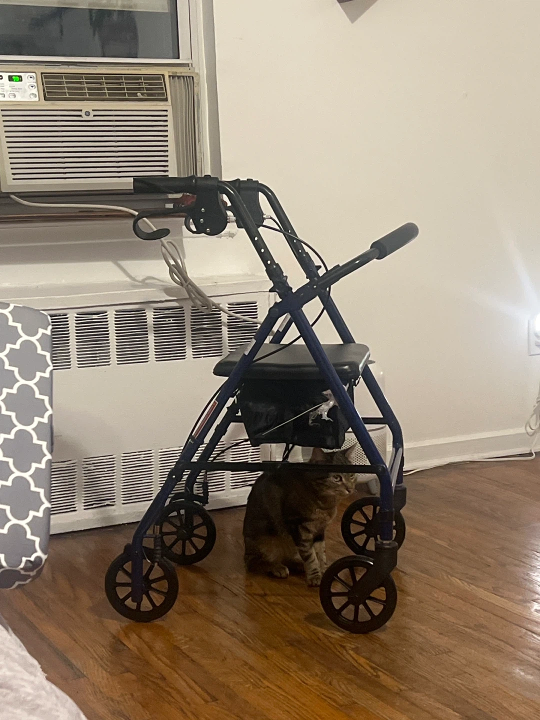 60Selling a blue four-wheel walker! It has a seat and a storage bag underneath. Perfect for anyone needing a little extra support while getting around
