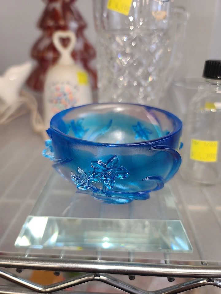 This is a beautiful BrandDWEZCLGMS blue glass bowl featuring a delicate floral design. It would make a lovely addition to any home decor. The bowl is in great condition and ready to be enjoyed!
