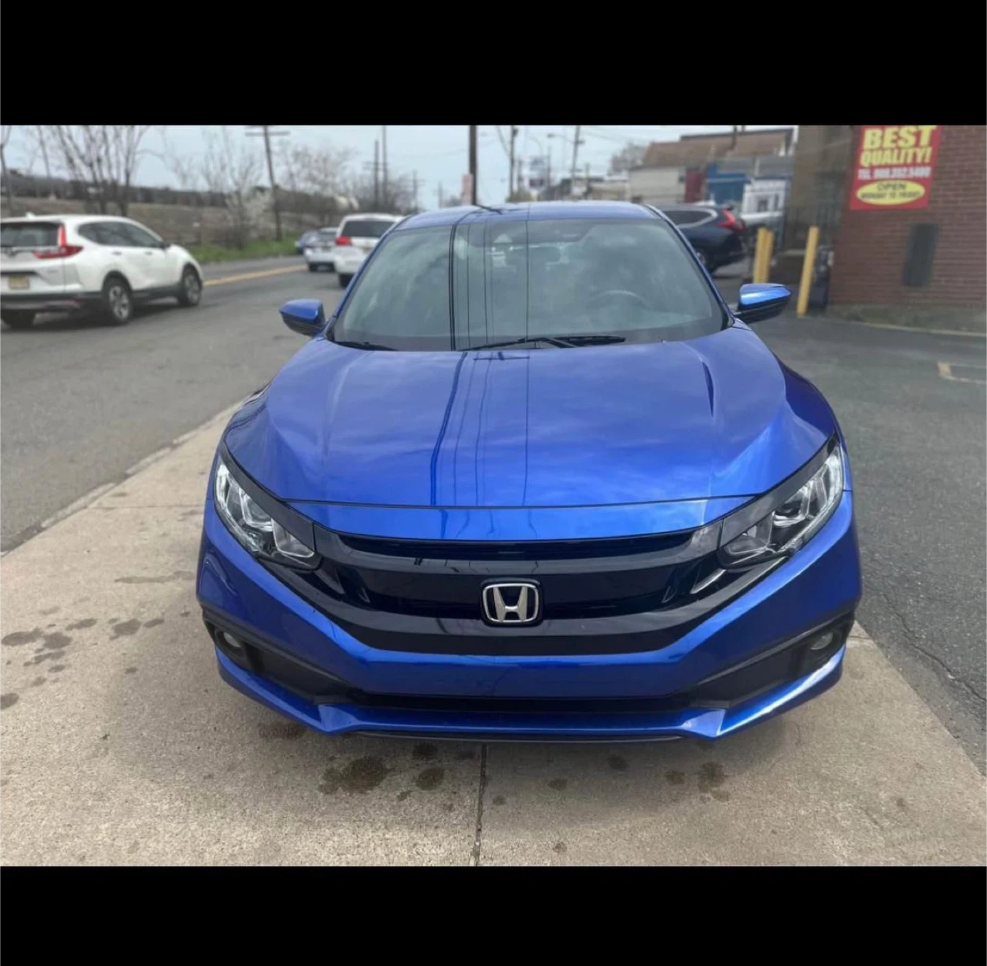 Selling a blue Honda Civic sedan. It has black wheels and a sporty look. The interior is black with gray accents. Feel free to message me with any questions!