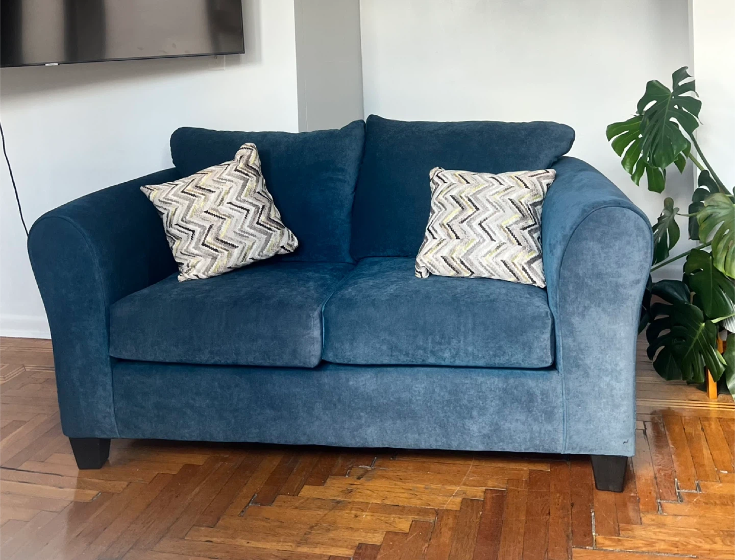 10Selling a cozy blue loveseat sofa! It's in great condition and would be perfect for a small living room or apartment. The cushions are soft and comfortable, making it a great spot to relax. It also comes with two decorative pillows!