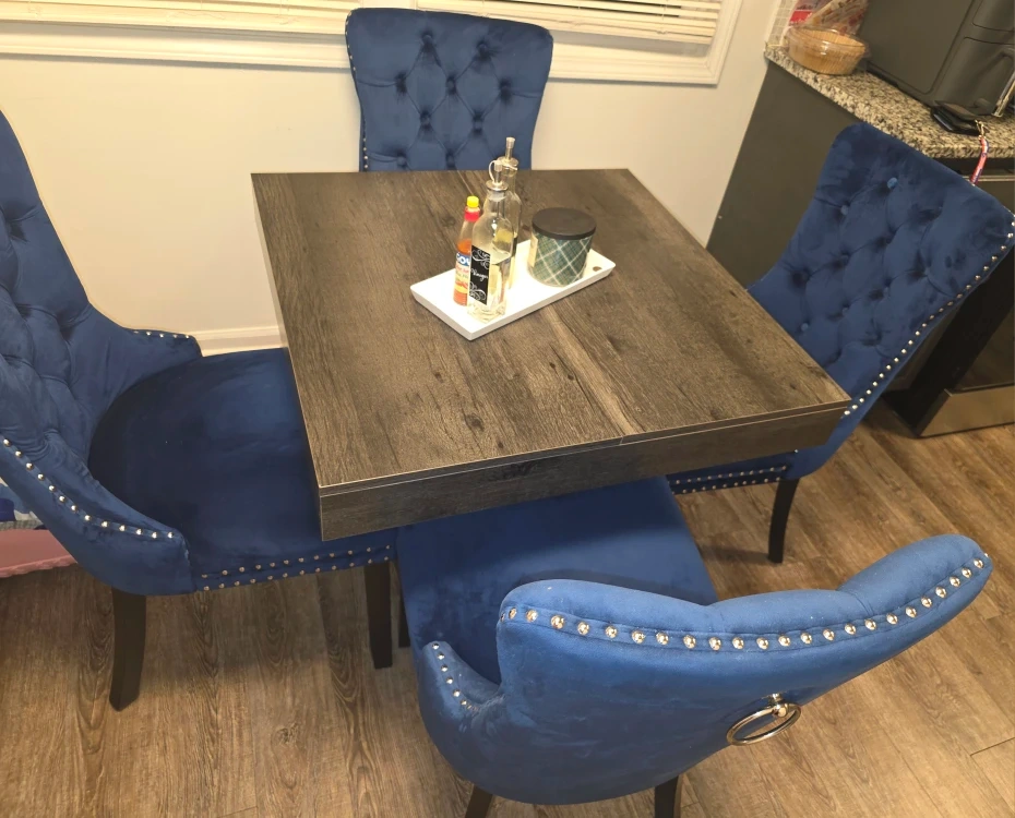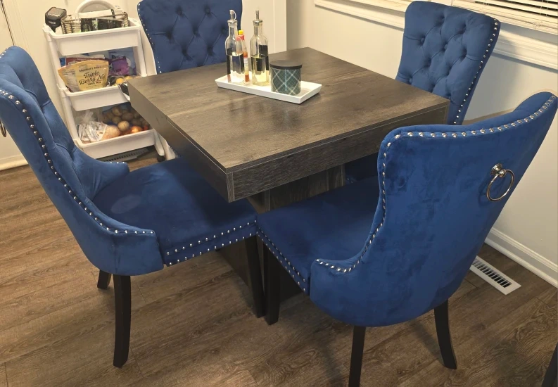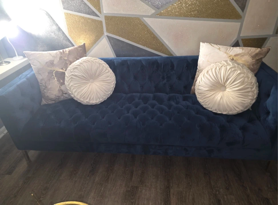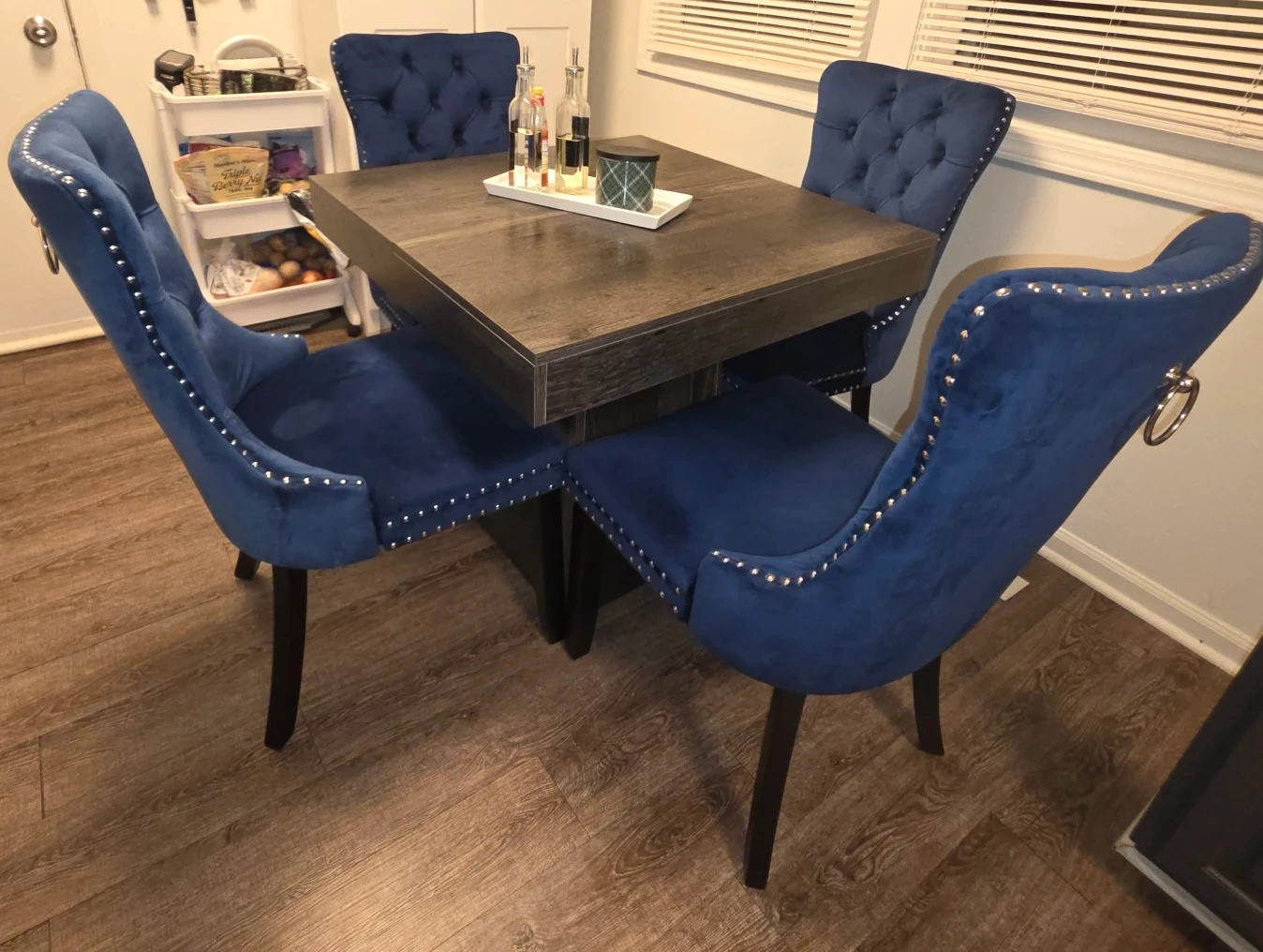 15Selling a beautiful set of blue velvet furniture! This set includes a chaise lounge, dining chairs, a sofa, and an armchair. All pieces are in good condition and feature a rich blue velvet upholstery that adds a touch of elegance to any room