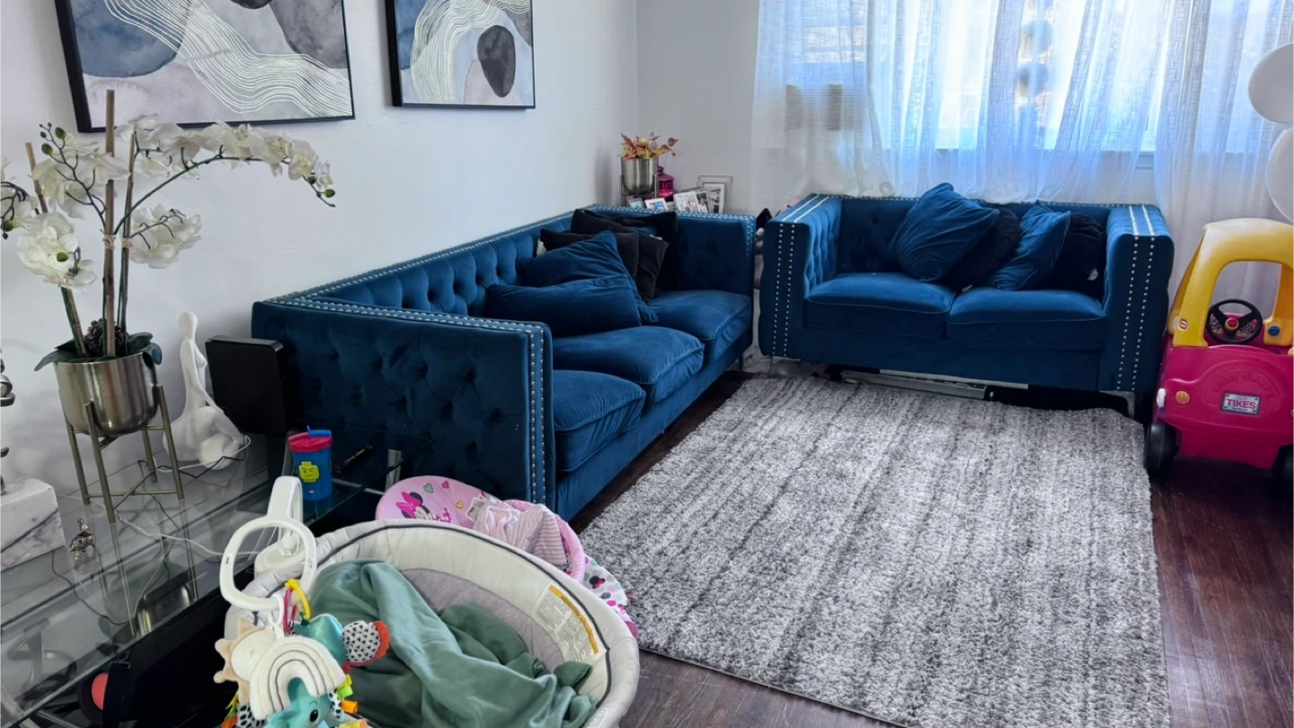 Selling a beautiful blue velvet sectional sofa, complete with a matching loveseat! This set would add a touch of elegance to any living room. The material is soft and luxurious, and the color is a rich, deep blue. It's in great condition and ready for a new home
