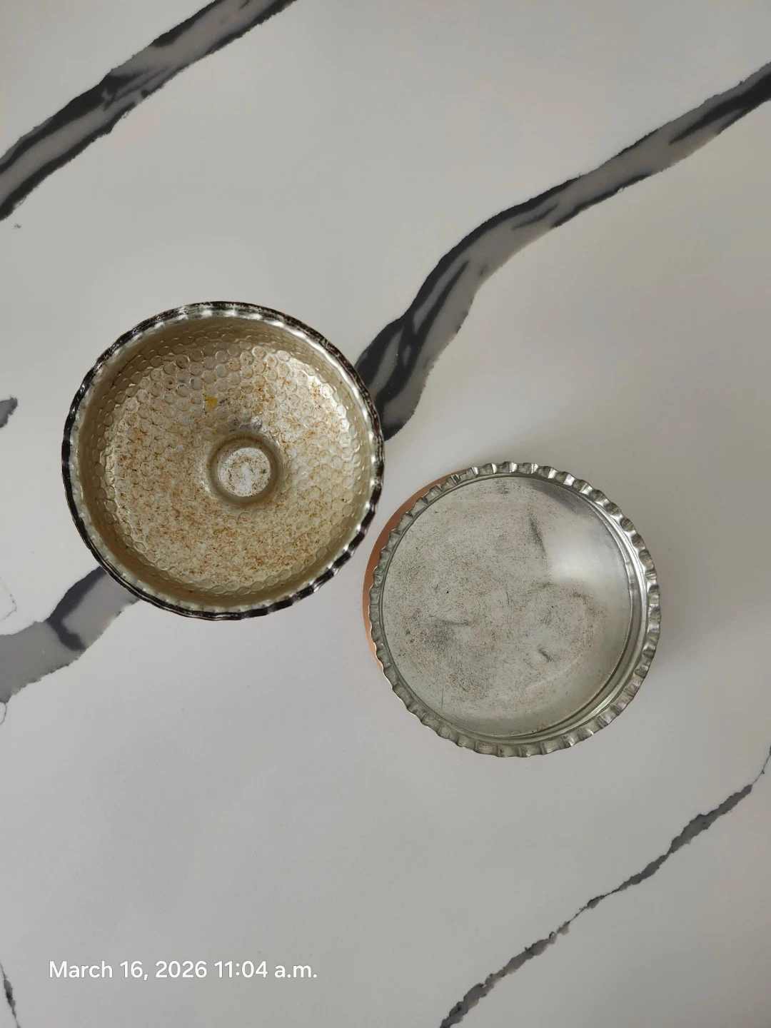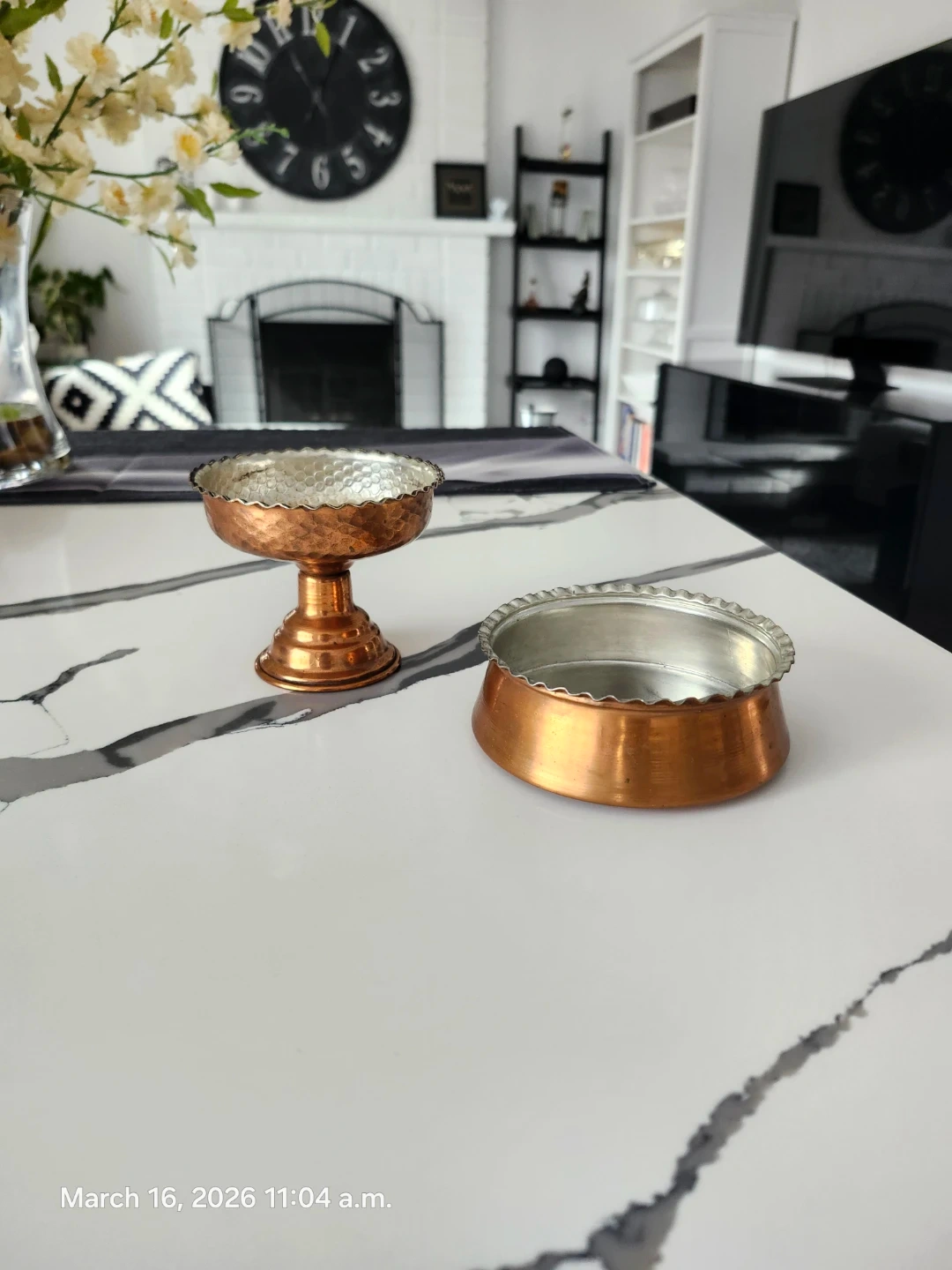 This set includes a small copper pedestal bowl and a matching copper dish. Both have a hammered interior finish. Great for serving small snacks or as decorative pieces.