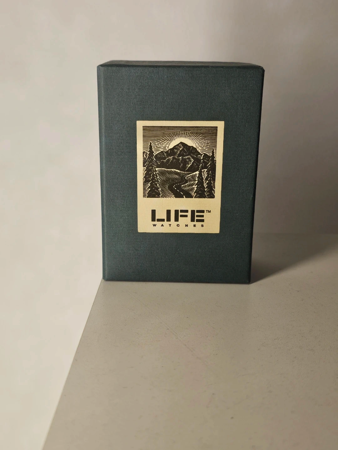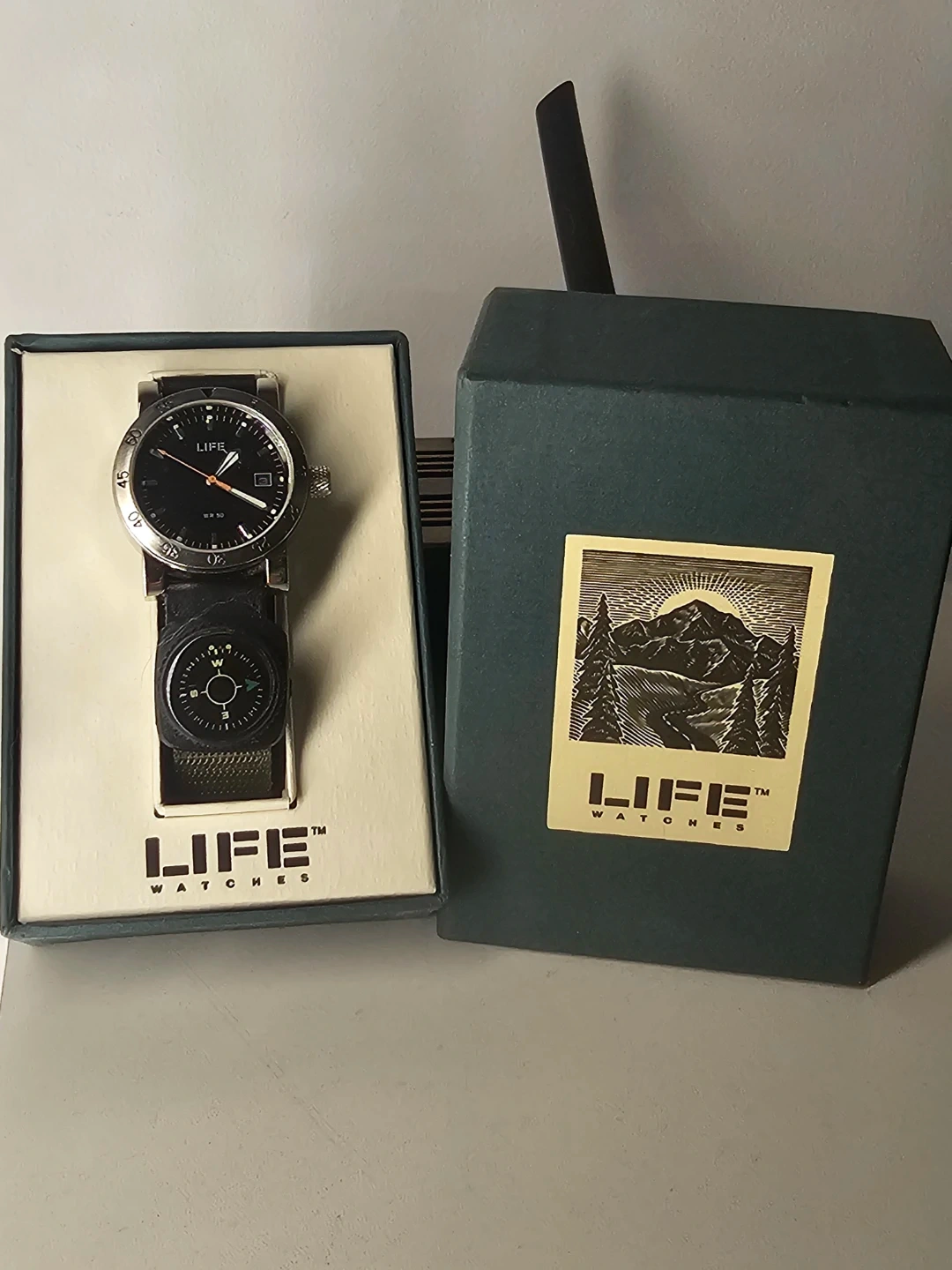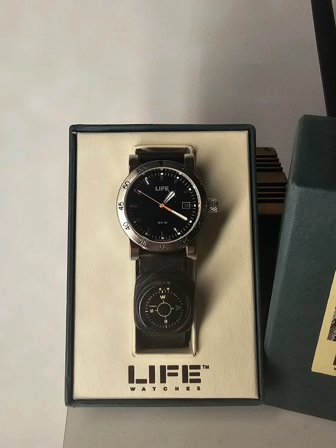 This LIFE Watches timepiece comes with a matching compass attachment. It's water-resistant up to 50 meters. The watch is presented in its original box.