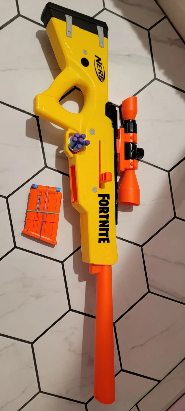 This is a Nerf Fortnite TS-1 blaster. It's yellow and orange with Fortnite branding. It comes with a detachable scope and a removable magazine. Includes a dart storage clip with some darts.