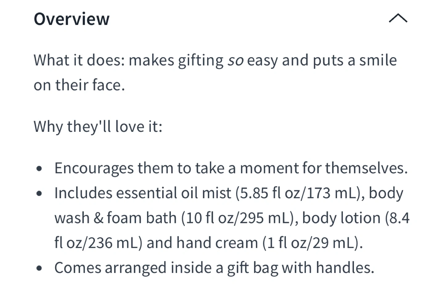 This Bath & Body Works Stress Relief set is perfect for a little self-care! It includes essential oil mist (5.85 fl oz/173 mL), body wash & foam bath (10 fl oz/295 mL), body lotion (8.4 fl oz/236 mL) and hand cream (1 fl oz/29 mL). It all comes arranged inside a gift bag with handles