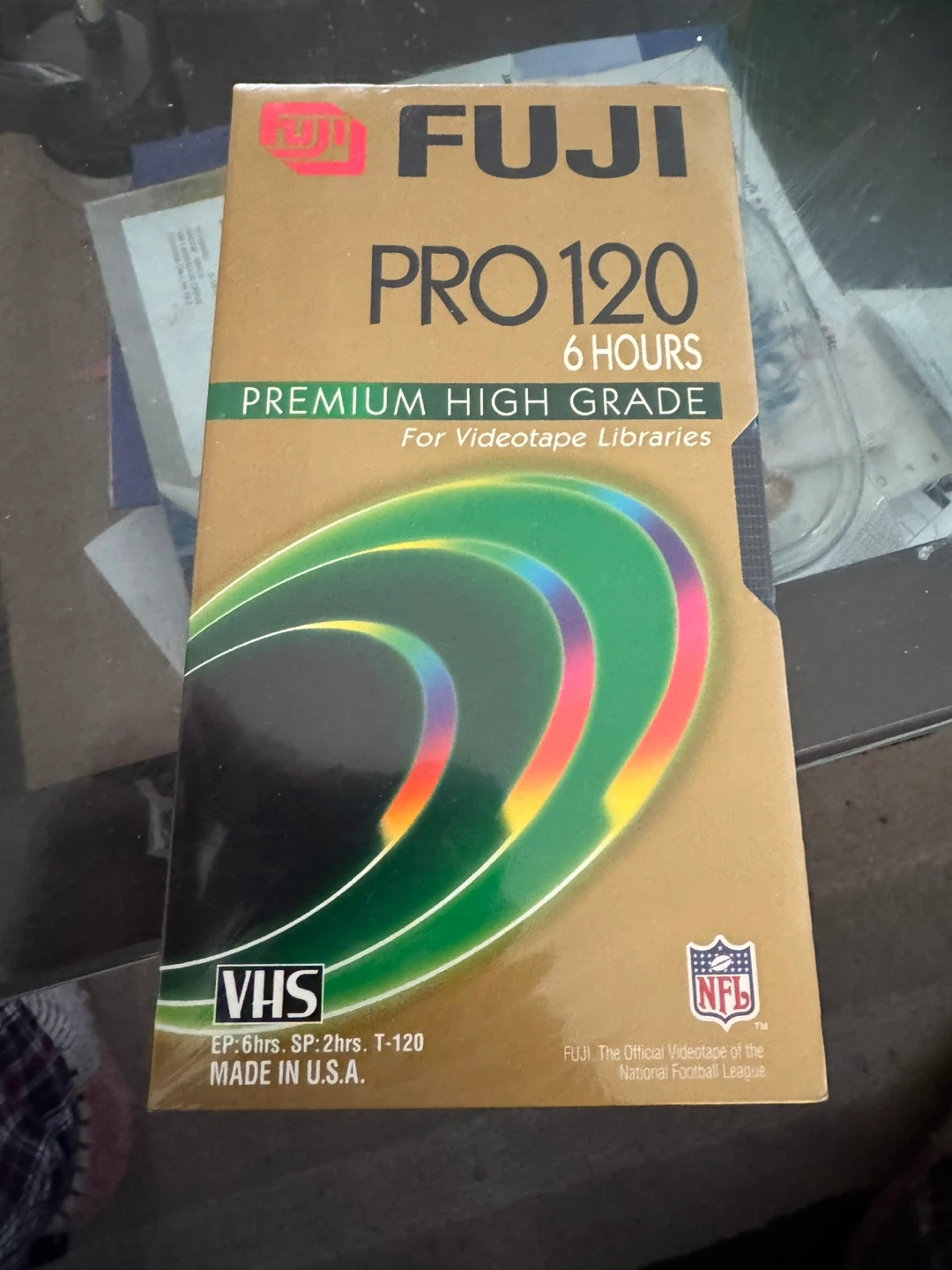 This is a Fuji PRO 120 VHS videotape. It's a Premium High Grade tape designed for videocassette libraries. The recording time is 6 hours.15/ dollar each