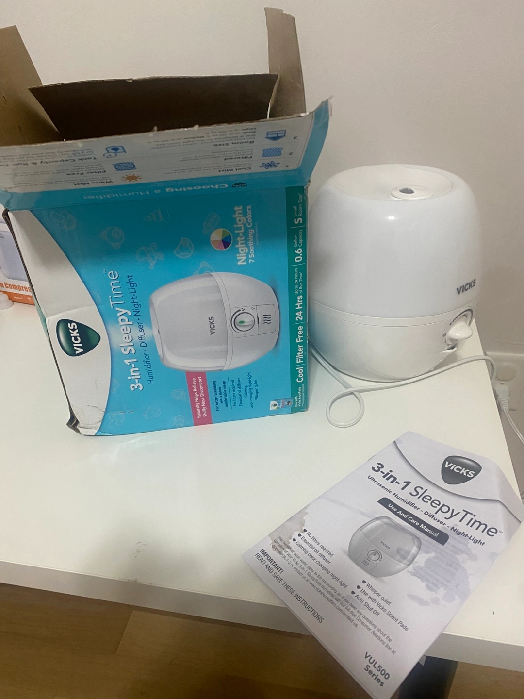 I'm selling a Vicks 3-in-1 SleepyTime Humidifier. It's a humidifier, diffuser, and night-light all in one! It has a cool filter and can run for up to 24 hours. Comes with the box and user manual