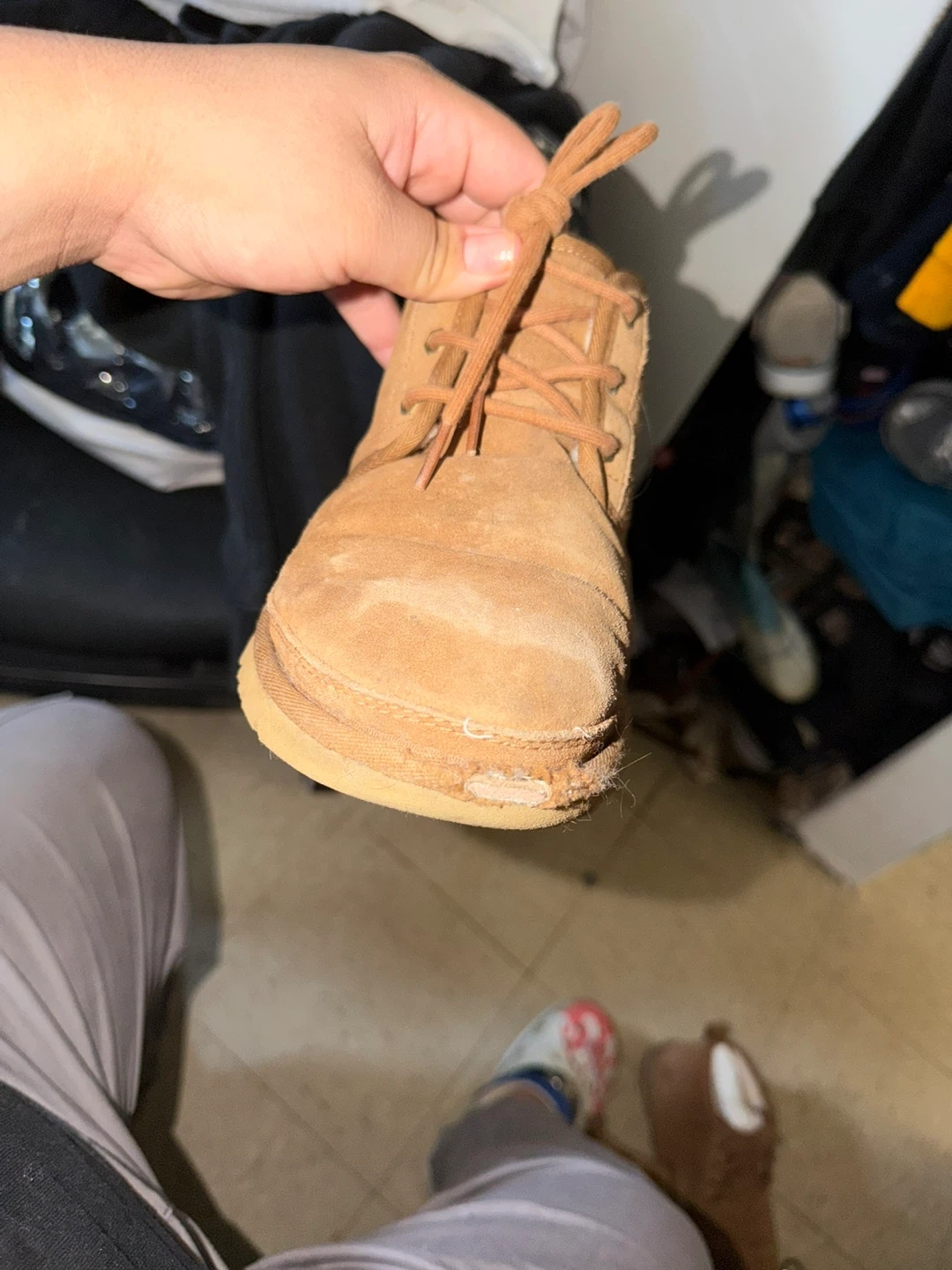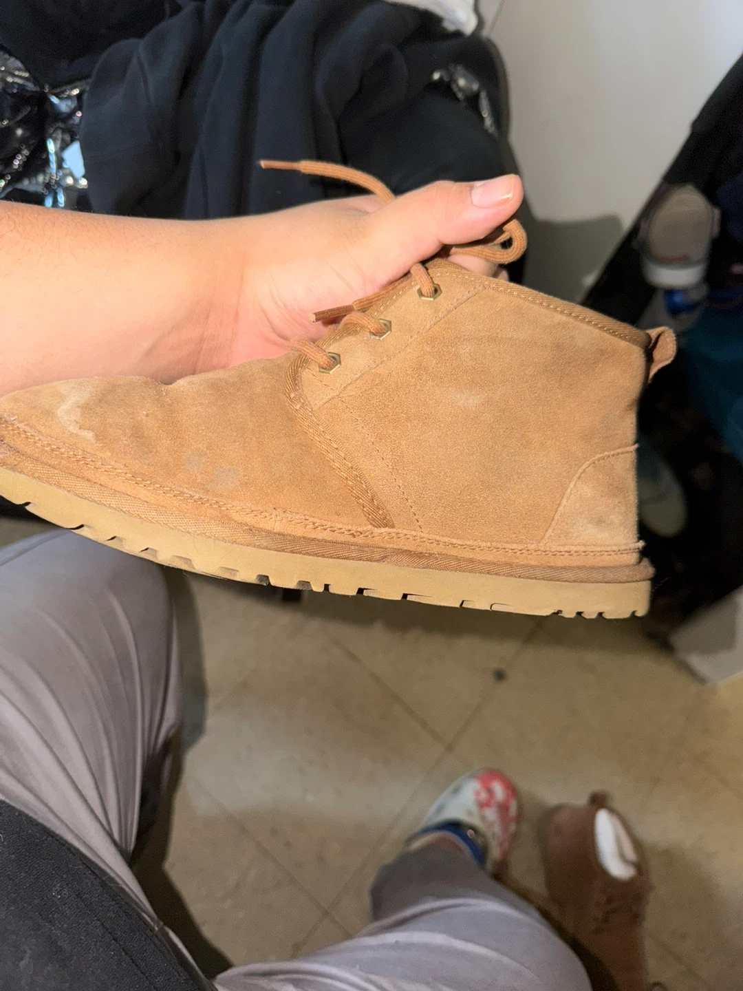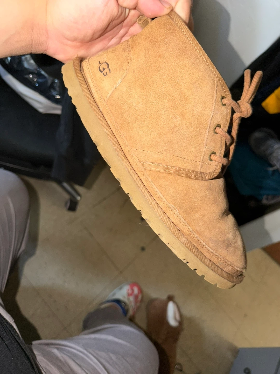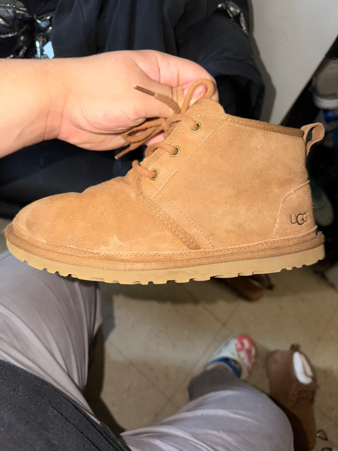 Tan suede UGG chukka boots. These boots show some wear and tear, particularly on the toe and sole edges. They feature lace-up closure and the classic UGG logo on the heel counter. Perfect for casual wear in cooler weather.