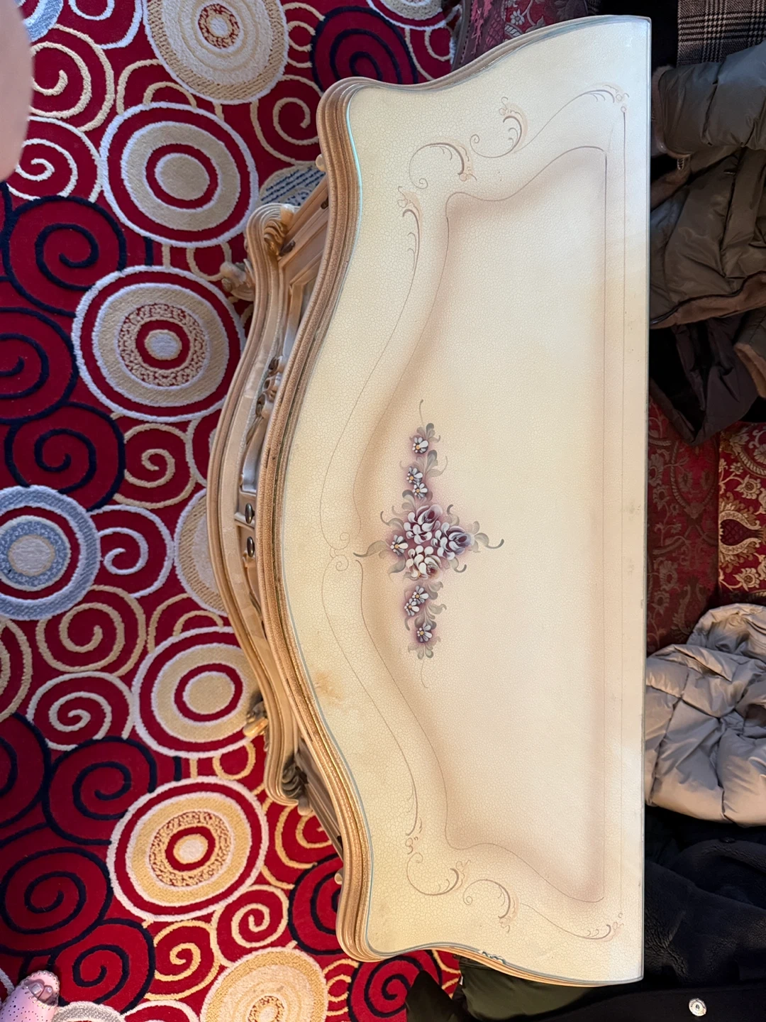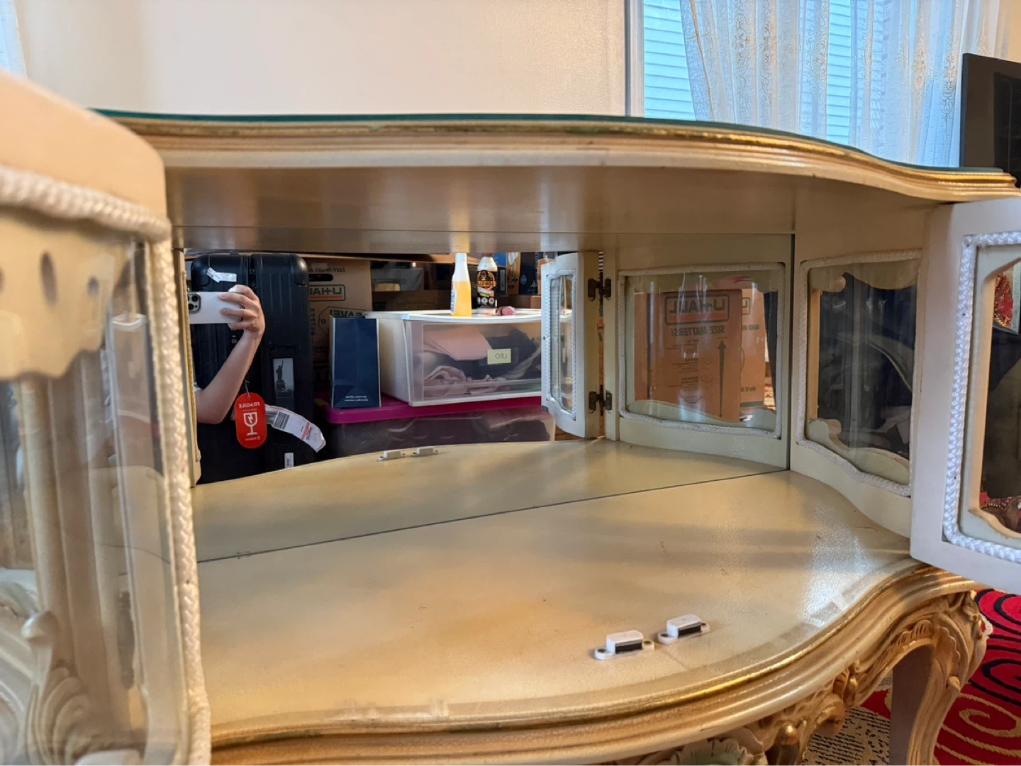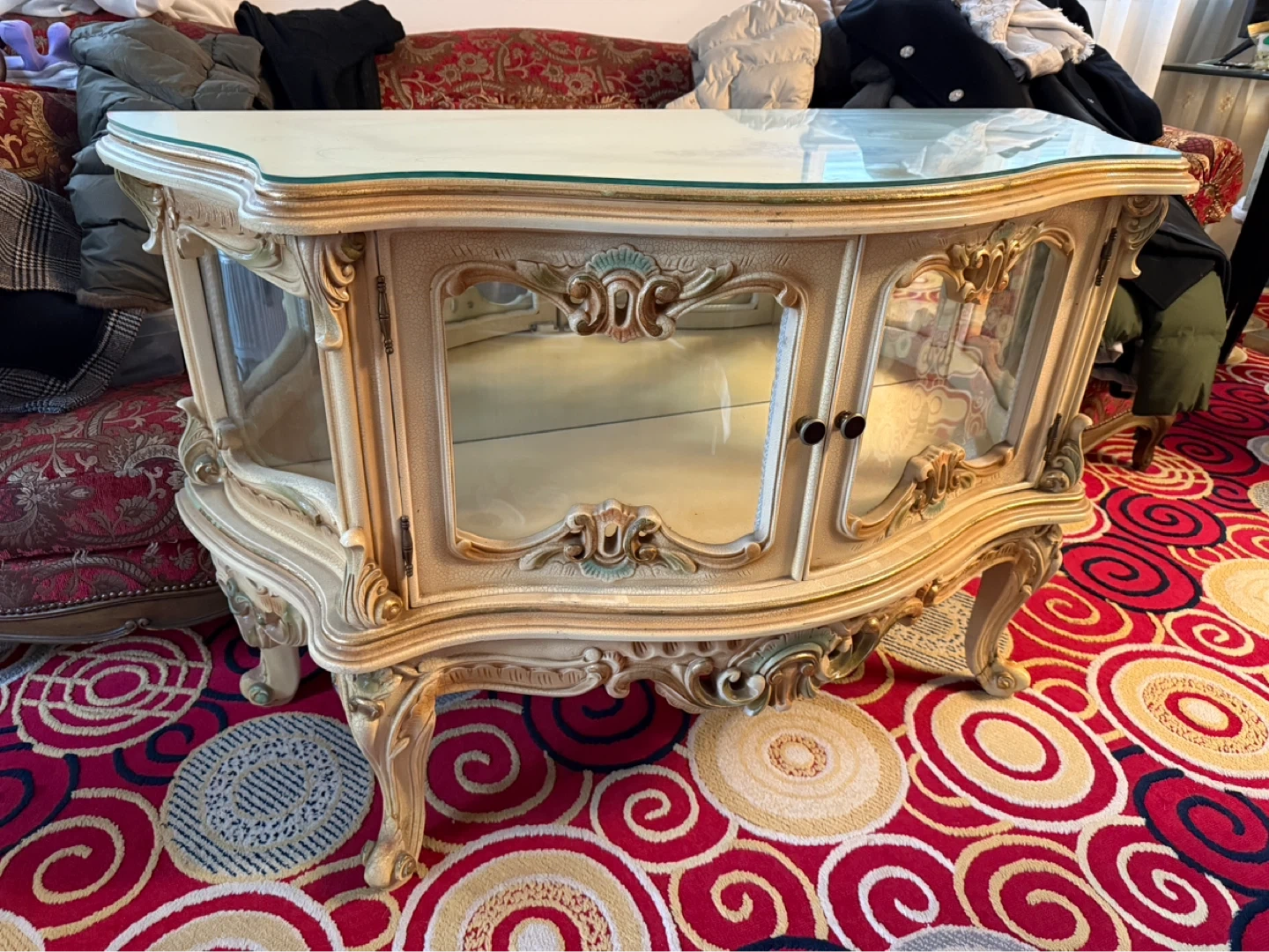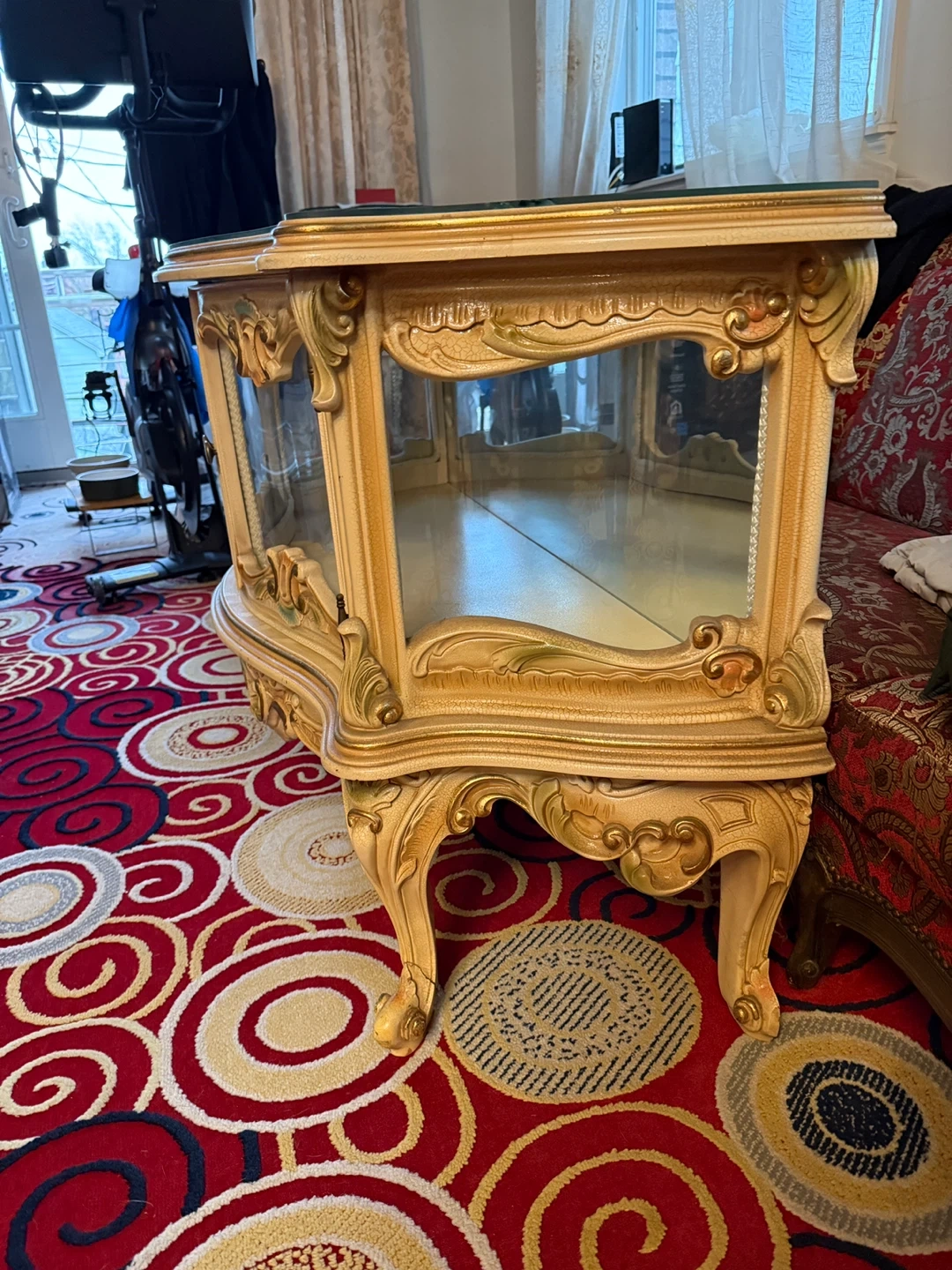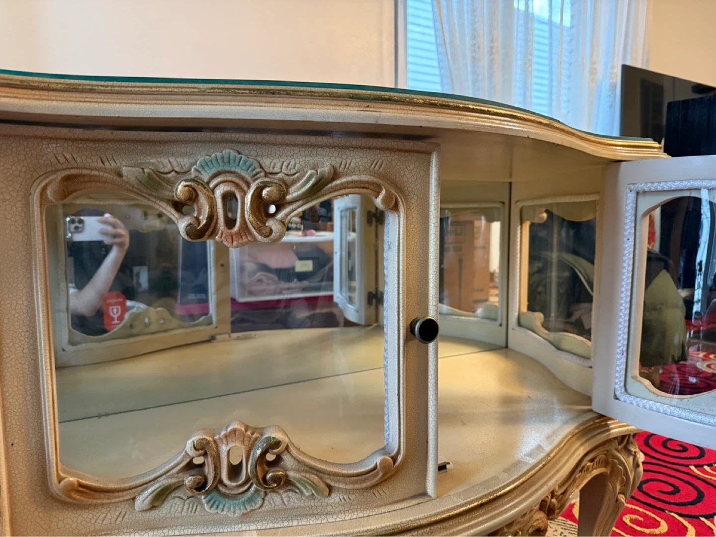 This vintage display cabinet features intricate detailing and ornate legs. It has glass doors and mirrored interior panels. Perfect for showcasing decorative items or collectibles!
