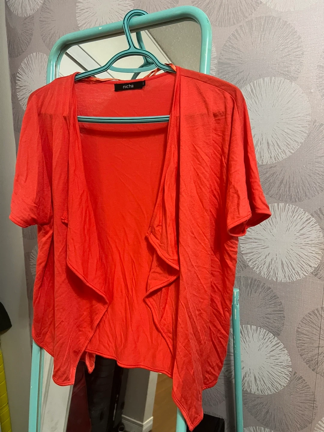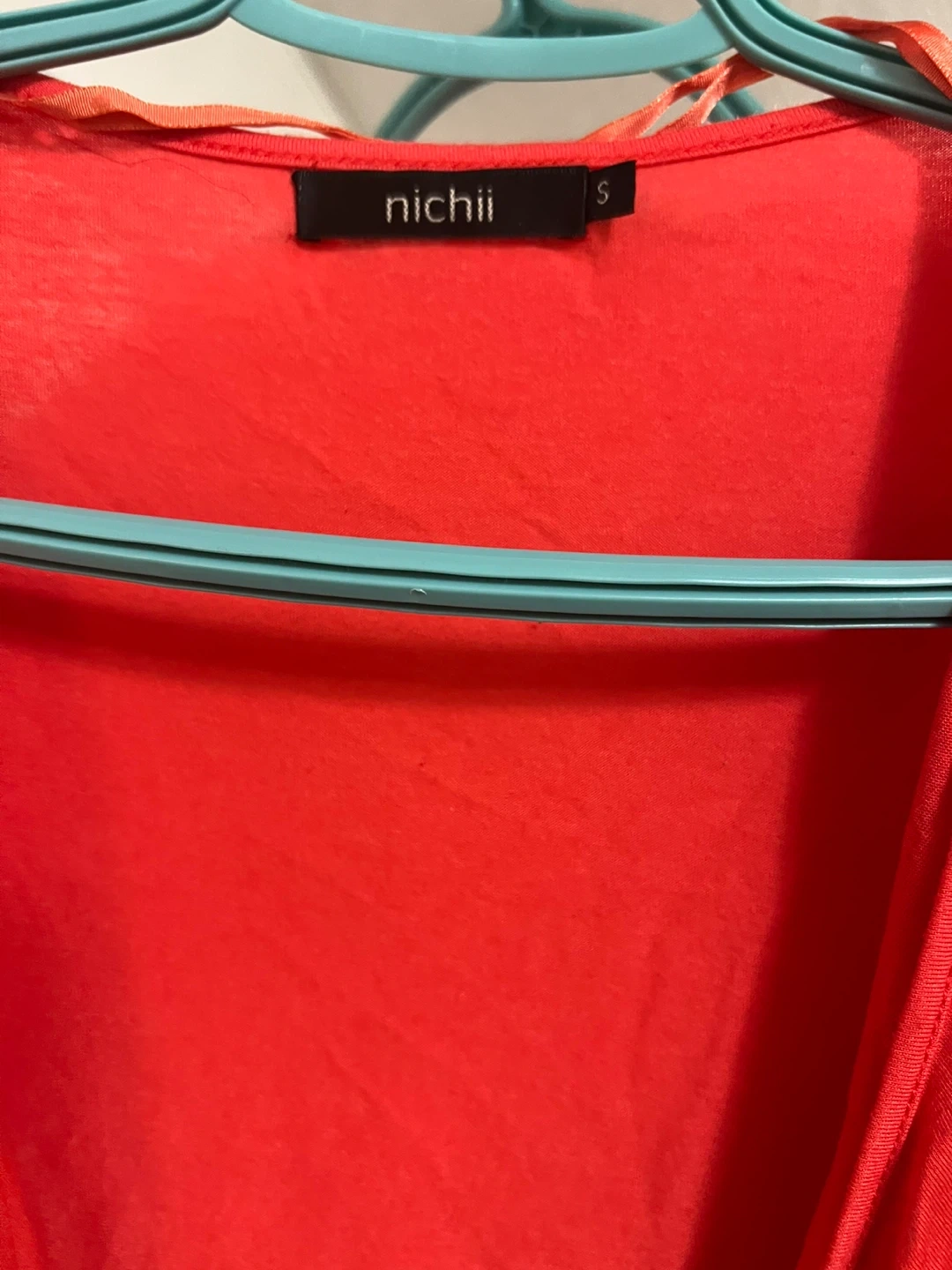 This is a red Nichii cardigan in size small. It's made of a lightweight fabric and features an open-front design with waterfall detailing. Perfect for layering over outfits!