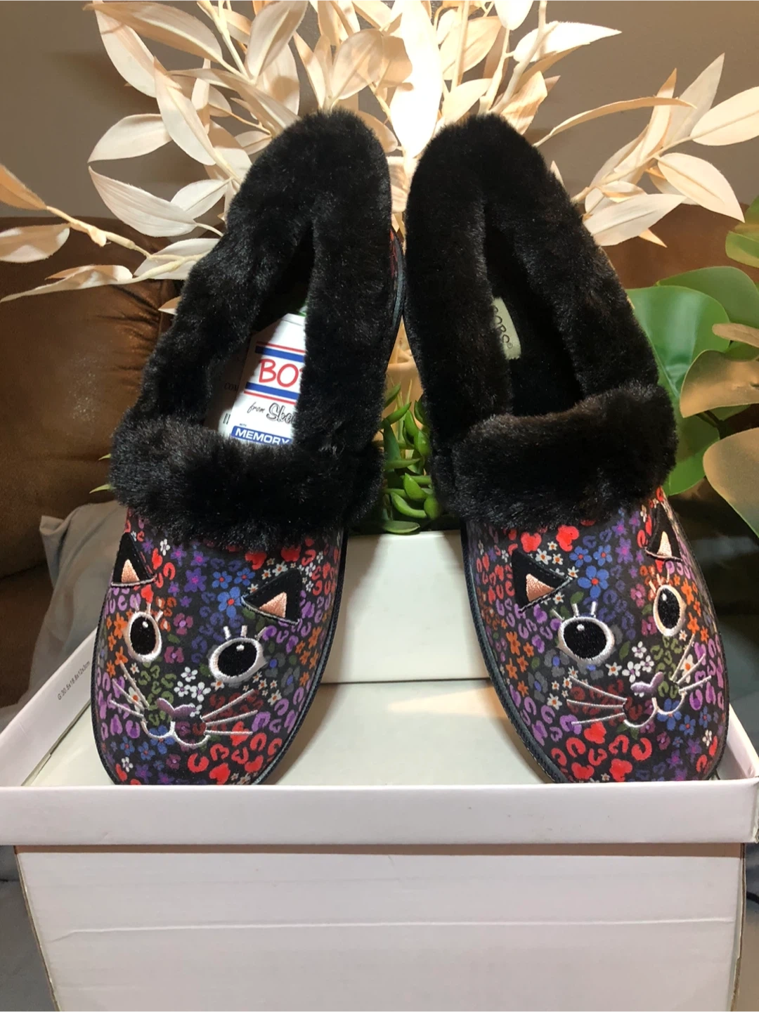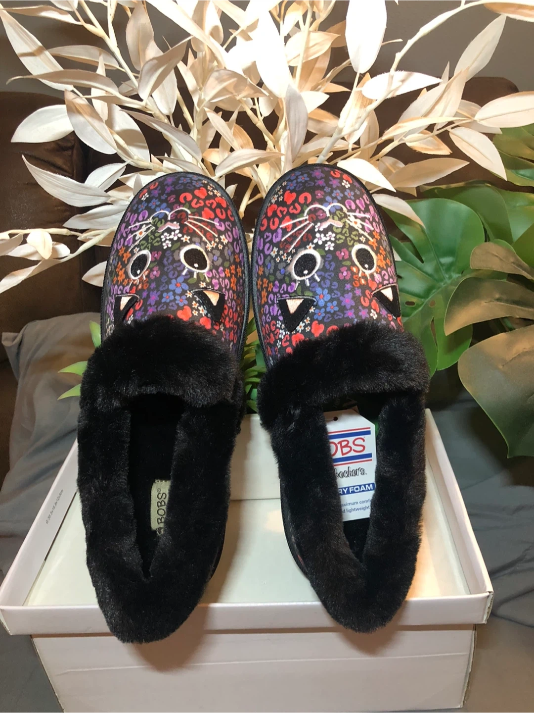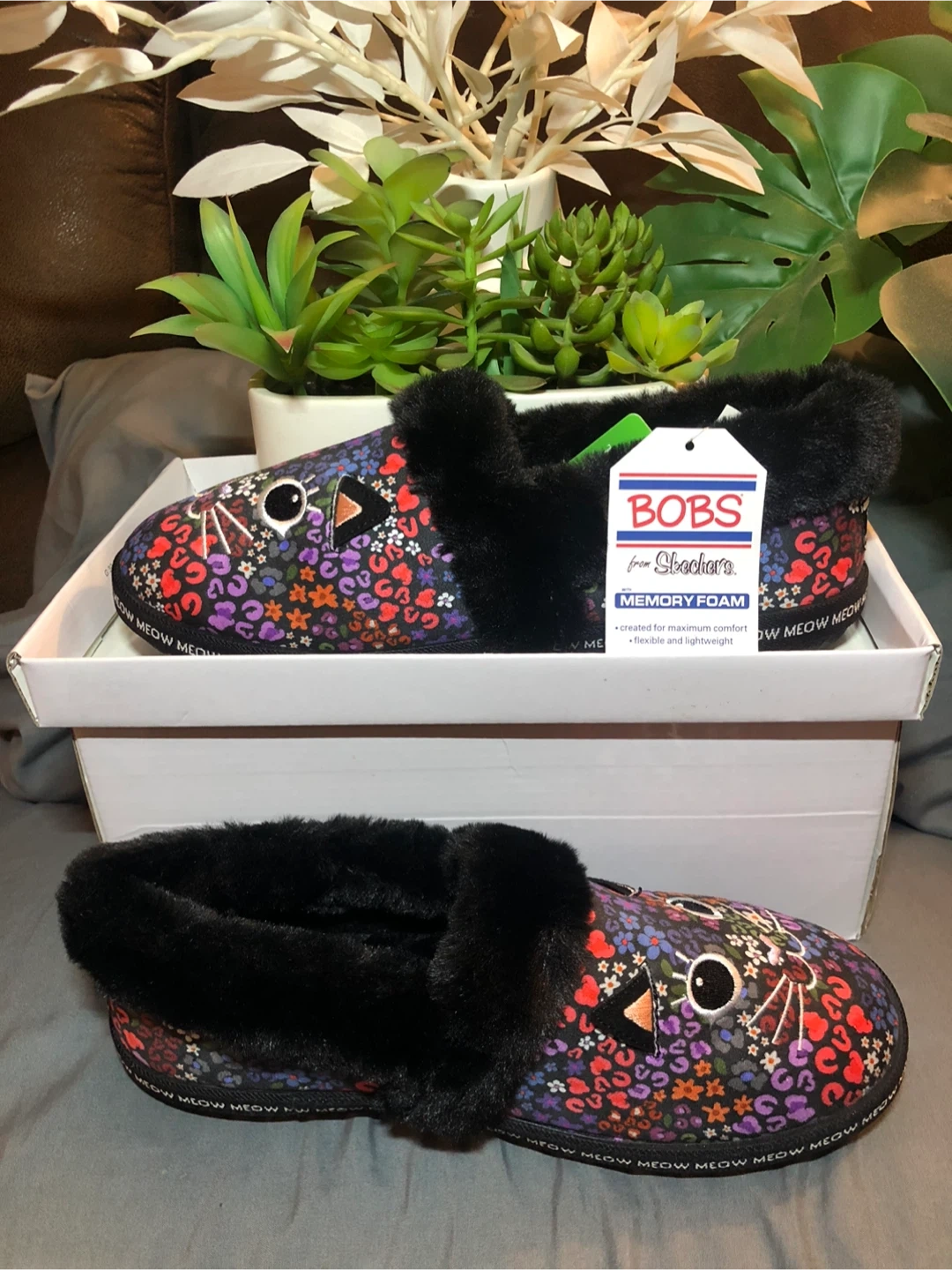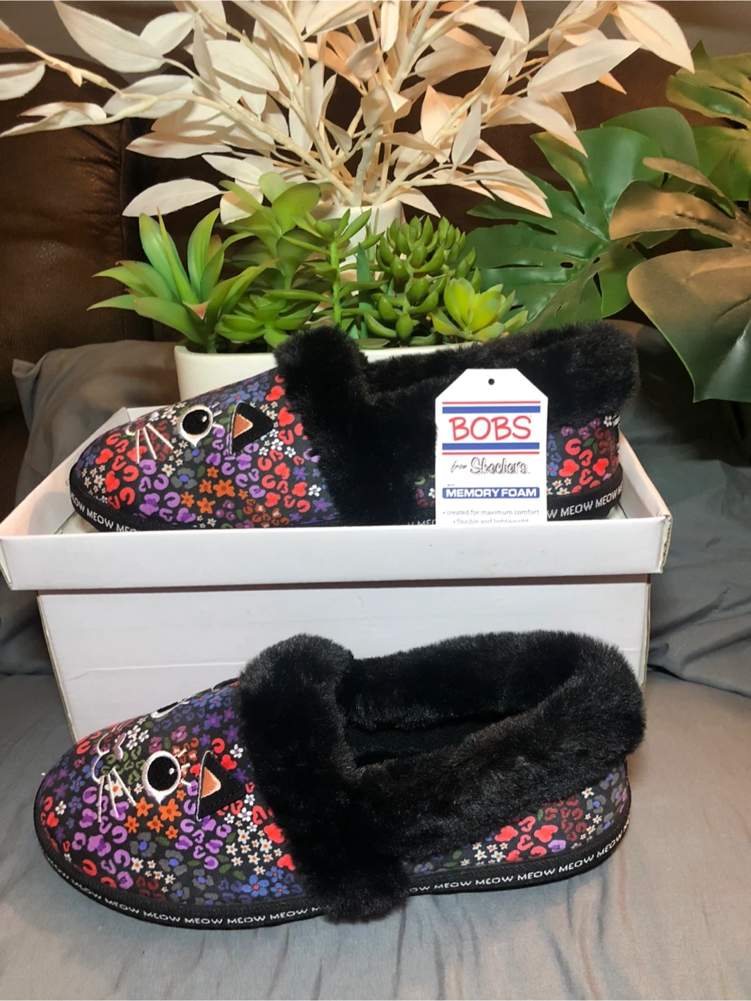 These BOBS from Skechers slippers are super cute and comfy! They feature a memory foam insole for maximum comfort and are lightweight and flexible. The slippers have a fun floral and cat design. Perfect for lounging around the house