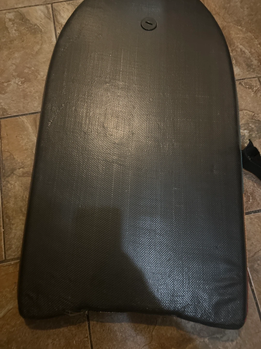 Selling a bodyboard with a vibrant orange, blue, and black striped design. It's in good condition and ready for some fun in the water!