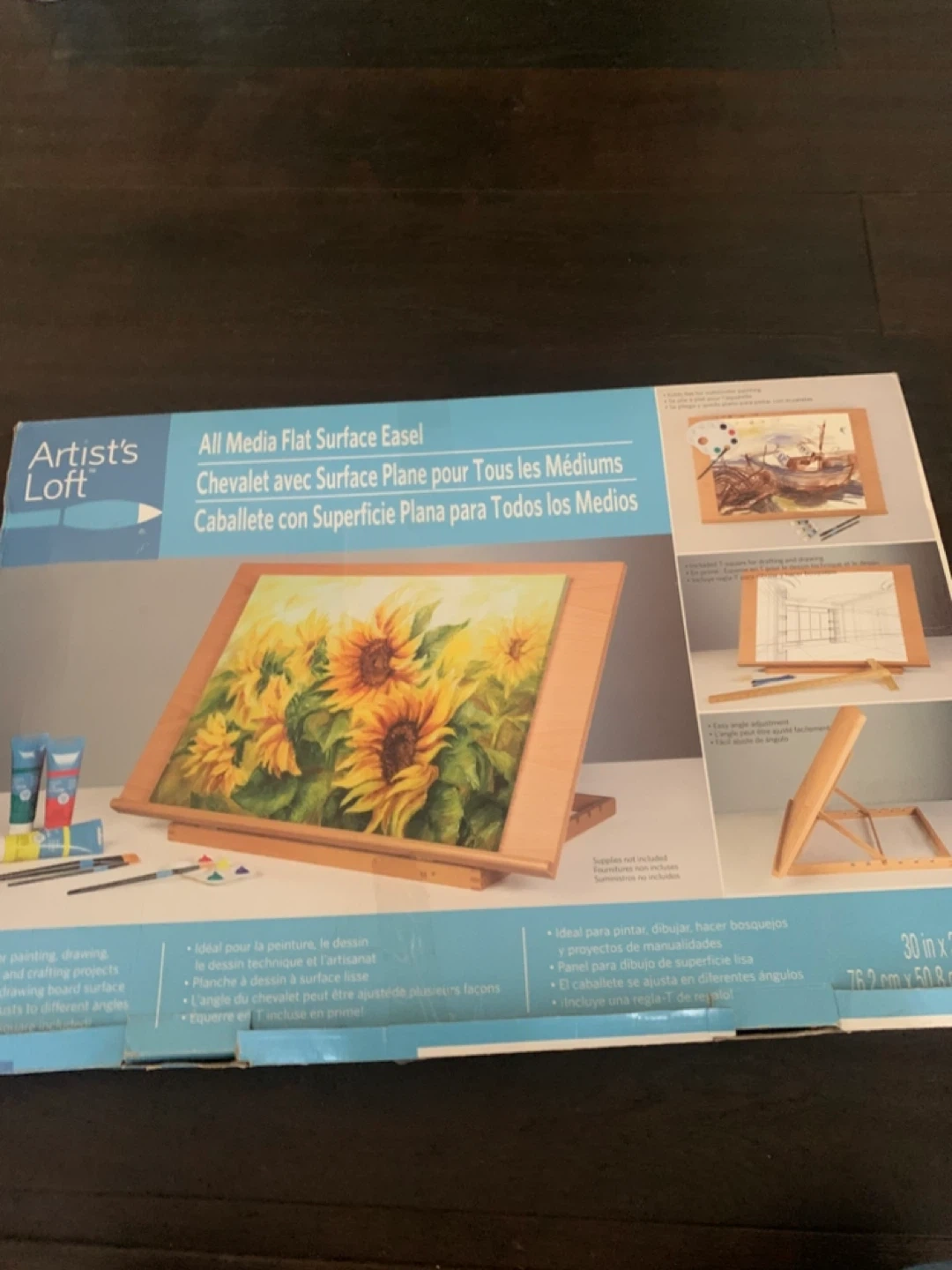 Selling an Artist's Loft all media flat surface easel. It's great for painting, drawing, and crafting projects. It has a smooth drawing board surface and easily adjusts to different angles. The easel measures 30 inches x 20 inches x 19 inches.