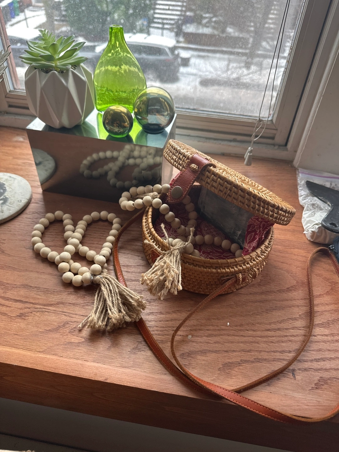 260Adorable round rattan crossbody bag. Brown leather accents. Interior fabric lining. Lightweight and perfect for summer.