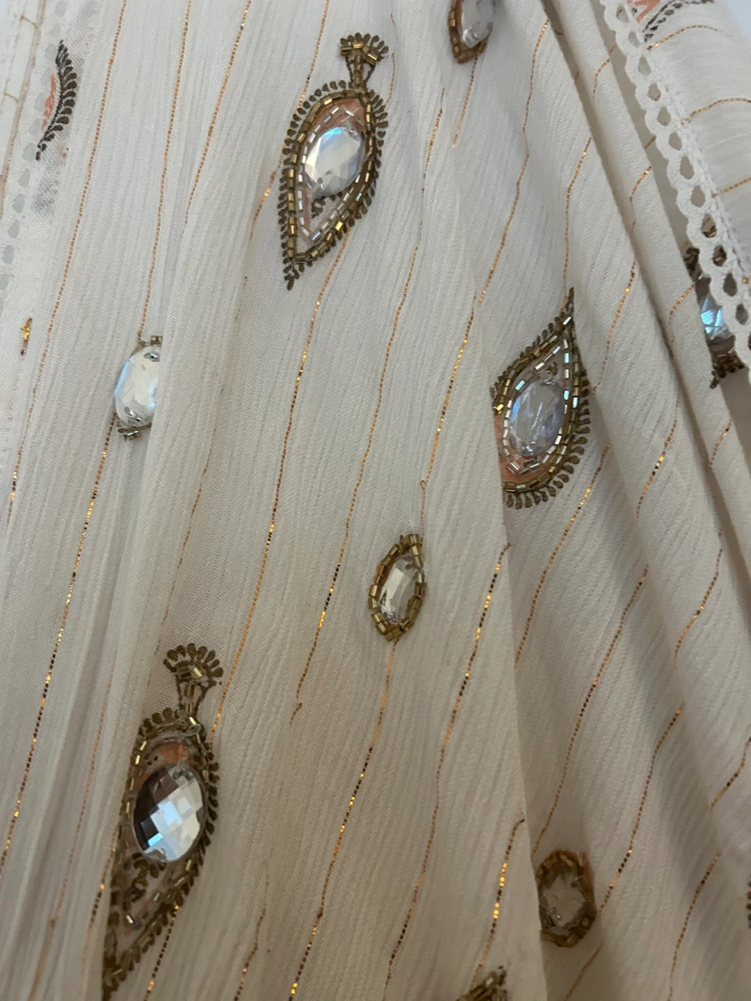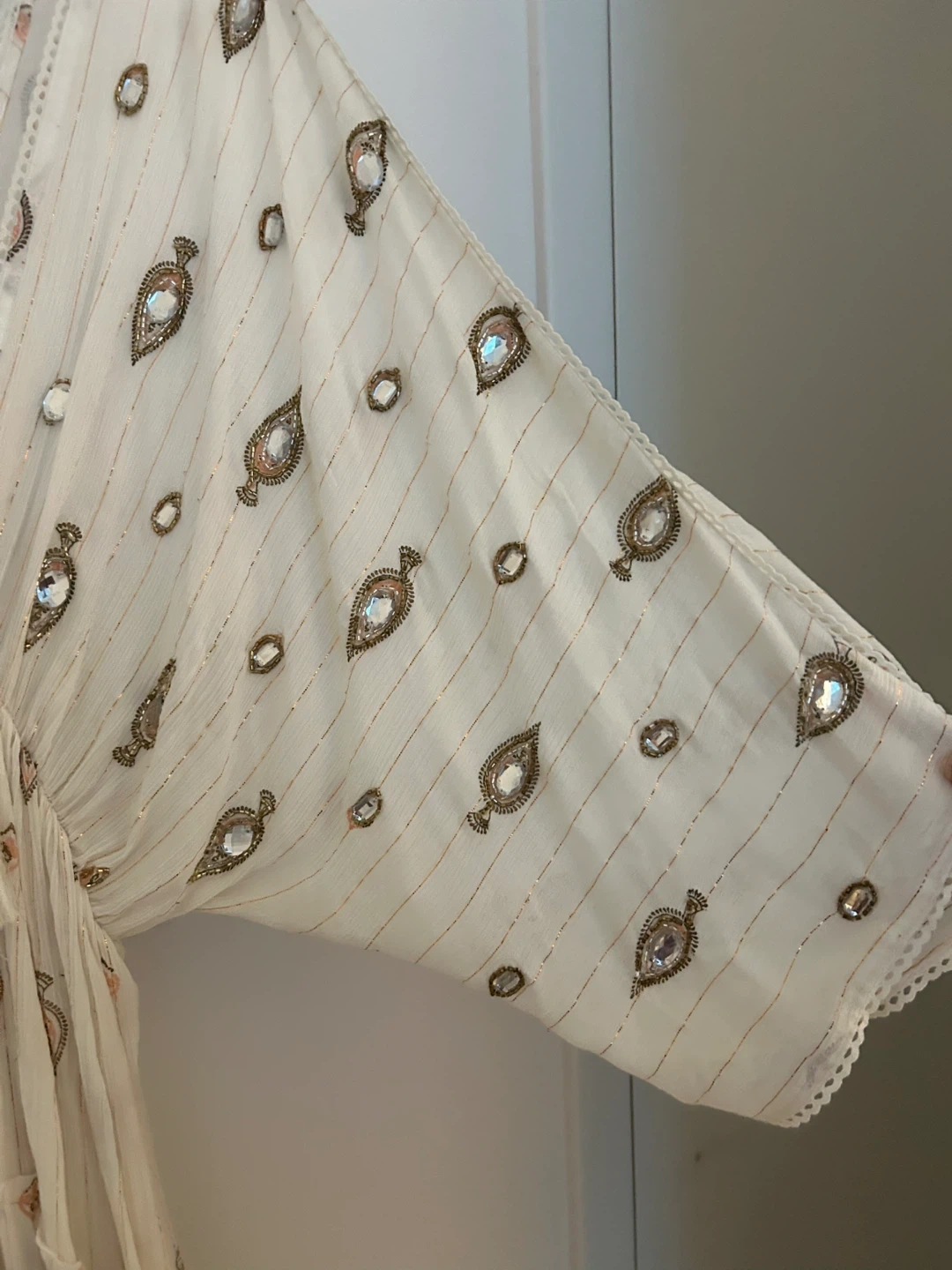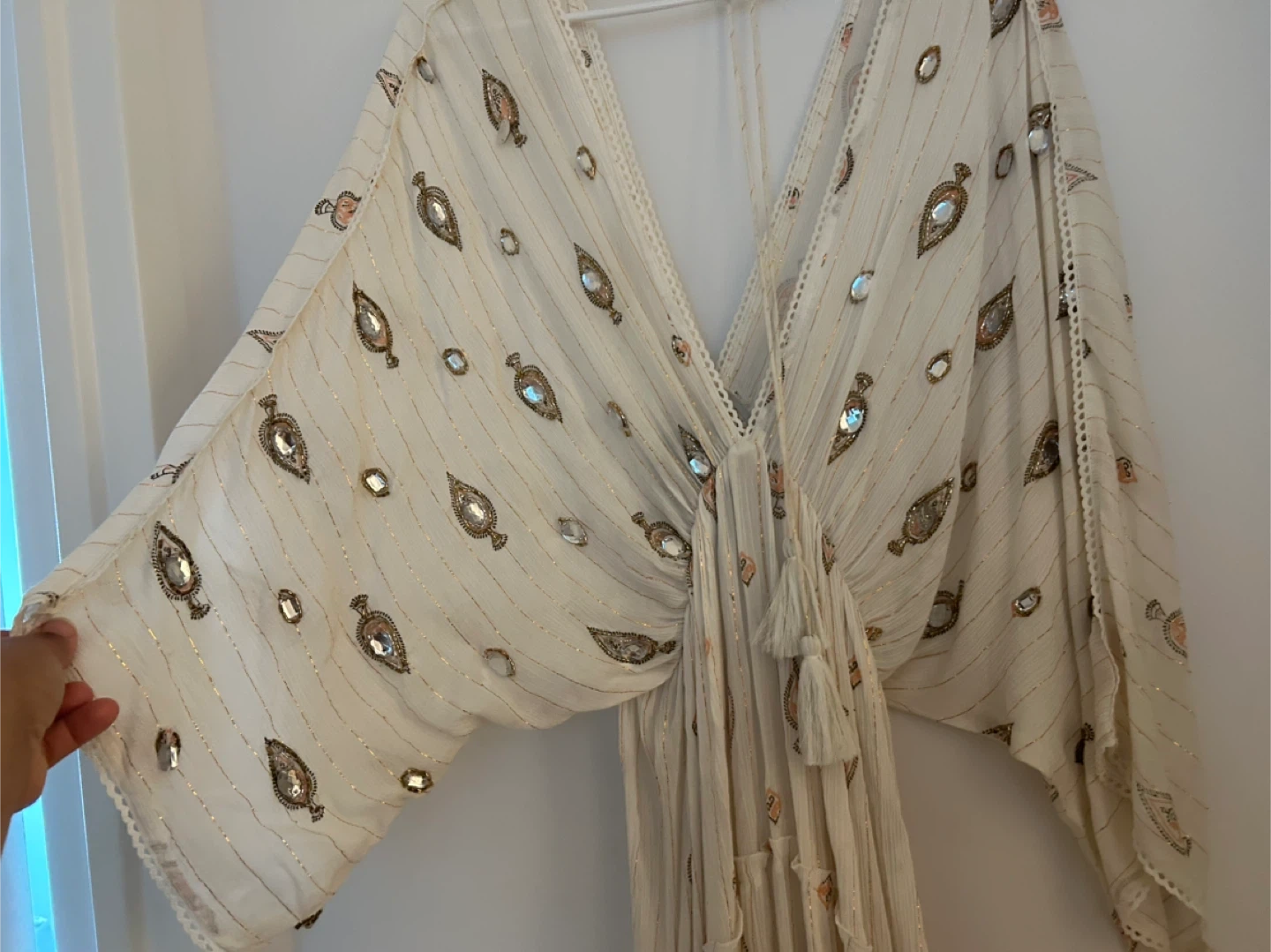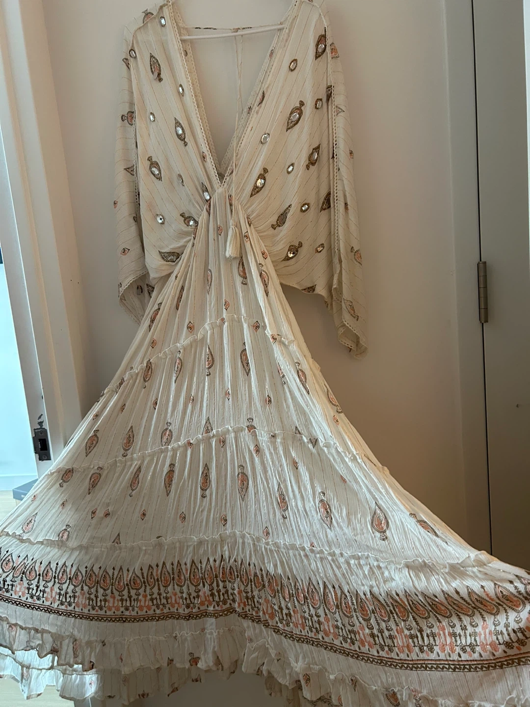 Selling a beautiful boho-style maxi dress! It's a cream color with intricate detailing and a flattering silhouette. Perfect for a summer day or a special occasion. The dress features a deep V-neck and long sleeves.