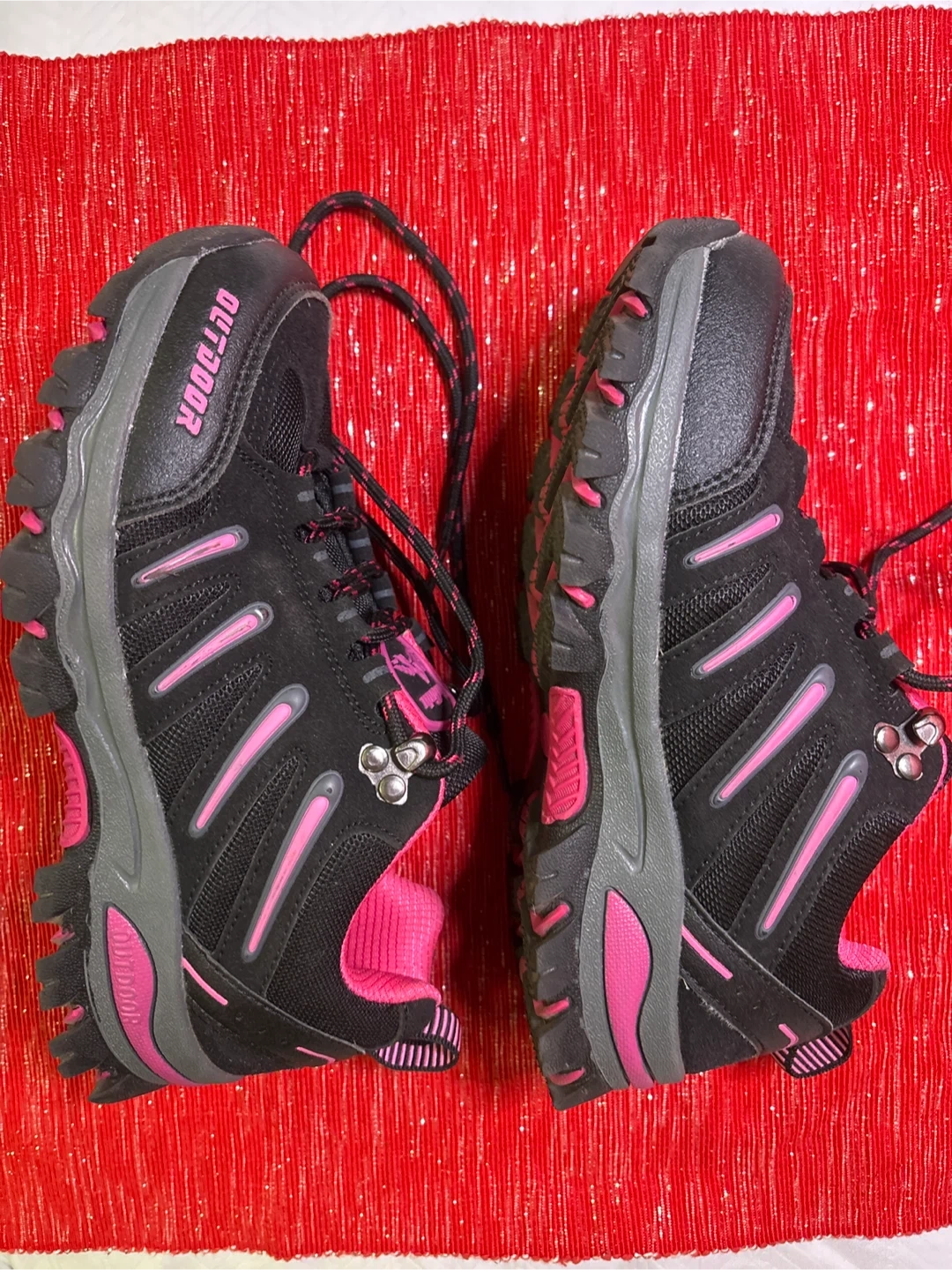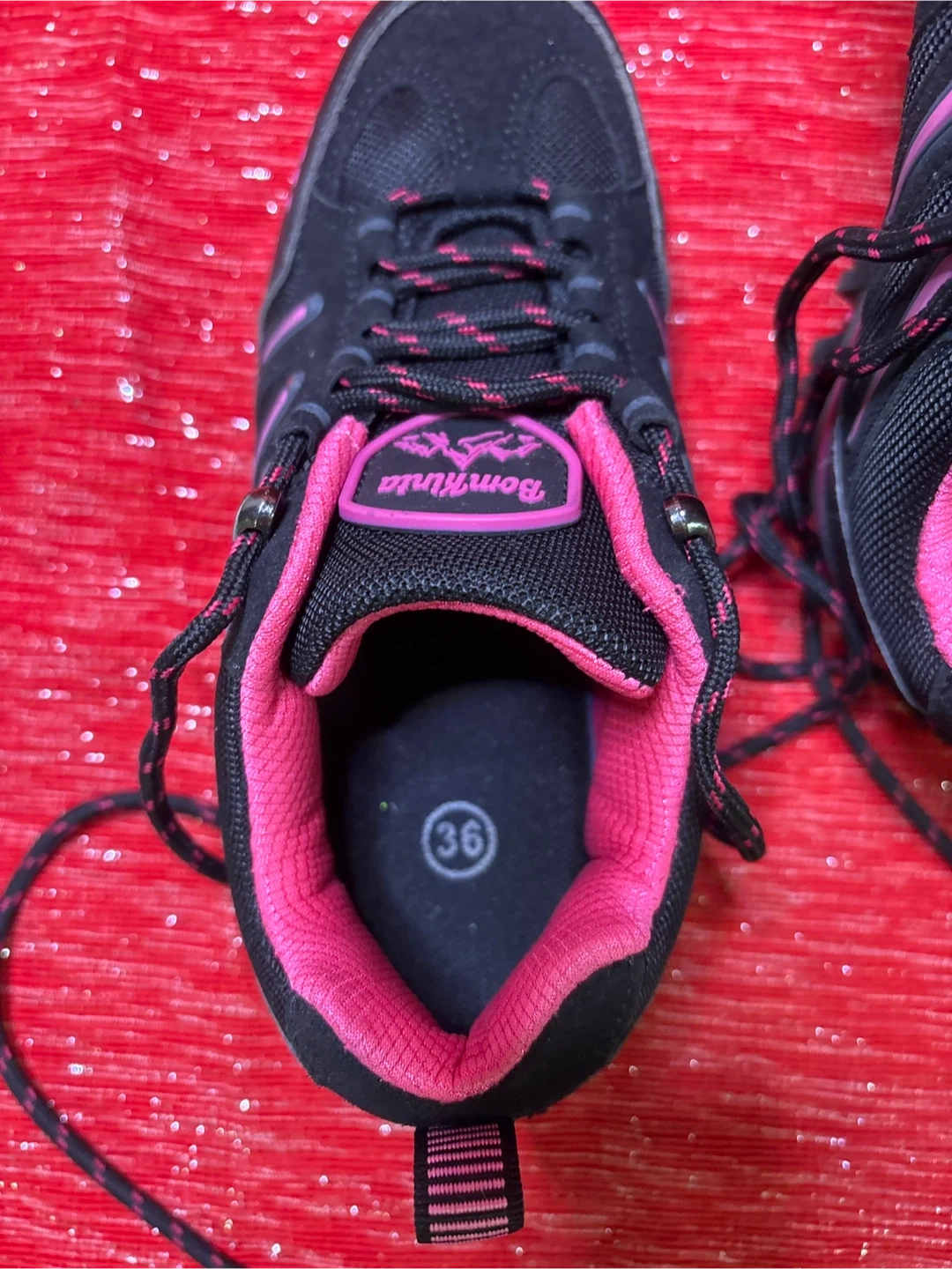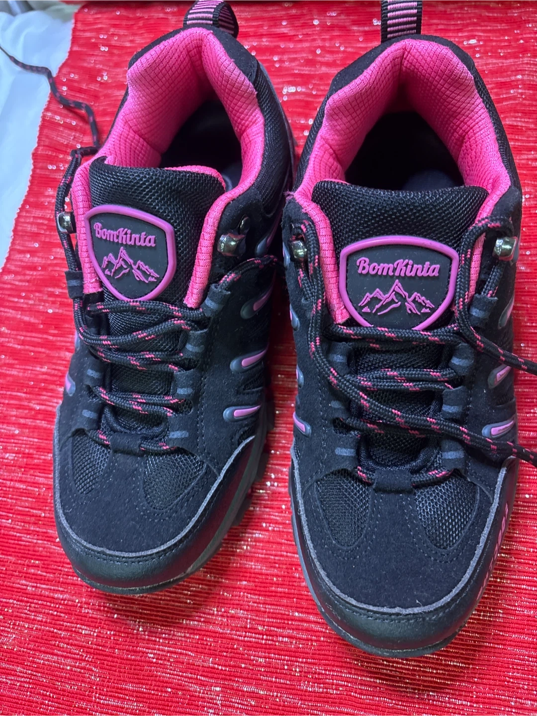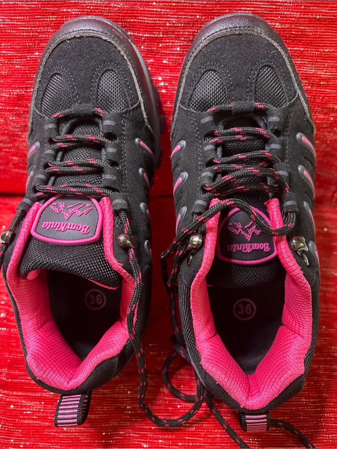 Selling a pair of Bomkinta women's hiking shoes! They are black with pink accents and in great condition. The size is 36, which is equivalent to a US size 6.