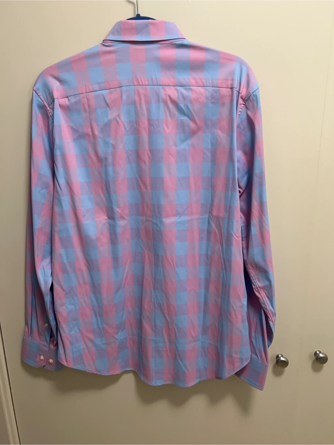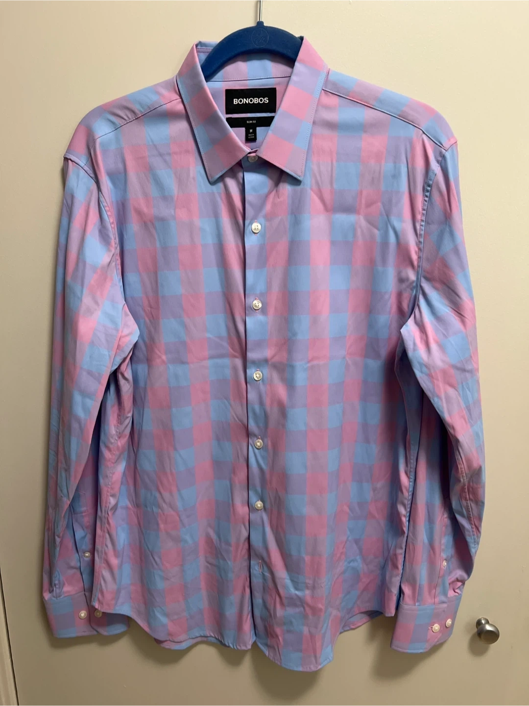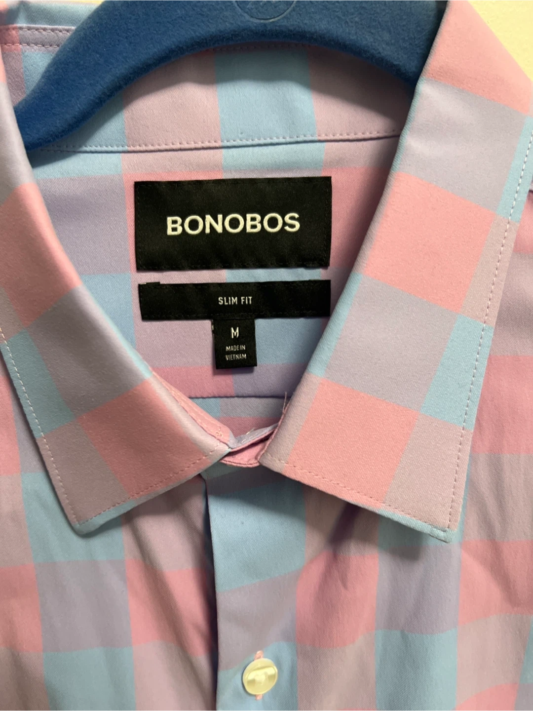 33Selling a Bonobos slim fit button-down shirt in size medium. It features a stylish pink and blue checkered pattern. Great for adding a pop of color to your wardrobe!