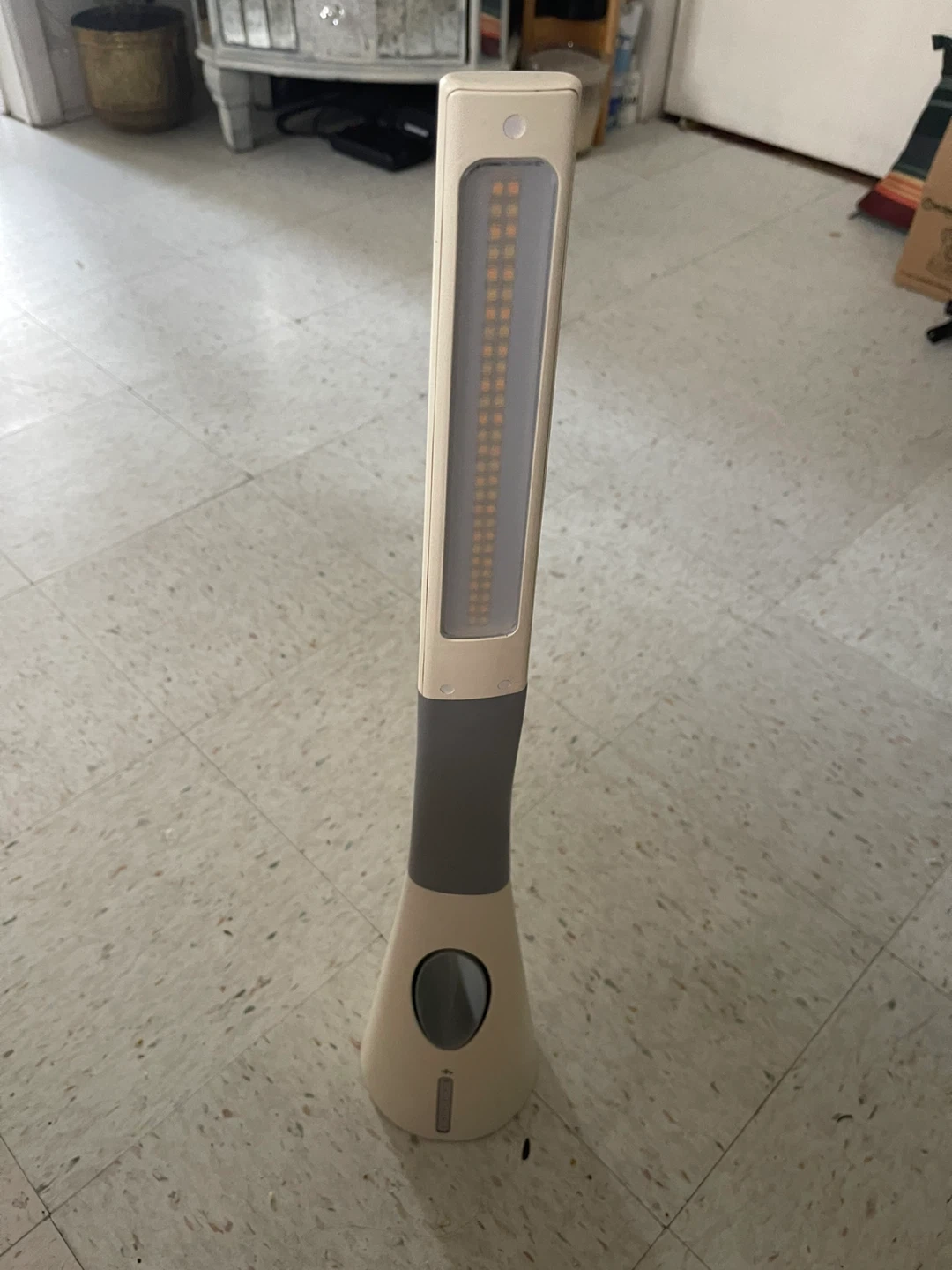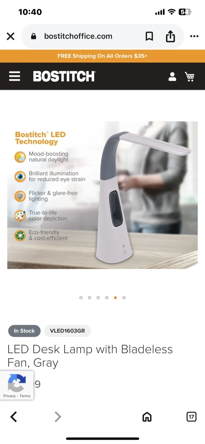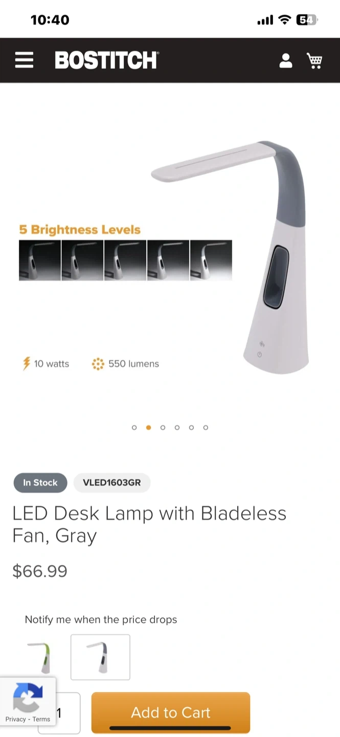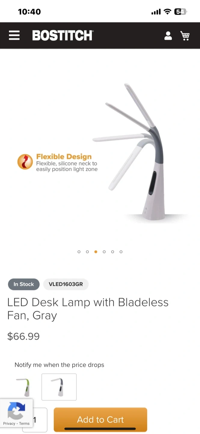 Selling a Bostitch LED desk lamp with a bladeless fan in gray. It features mood-boosting natural daylight and brilliant illumination for reduced eye strain. It also has flicker and glare-free lighting, and true-to-life color depiction. It's eco-friendly and cost-efficient. Originally priced at $66.99 + tax