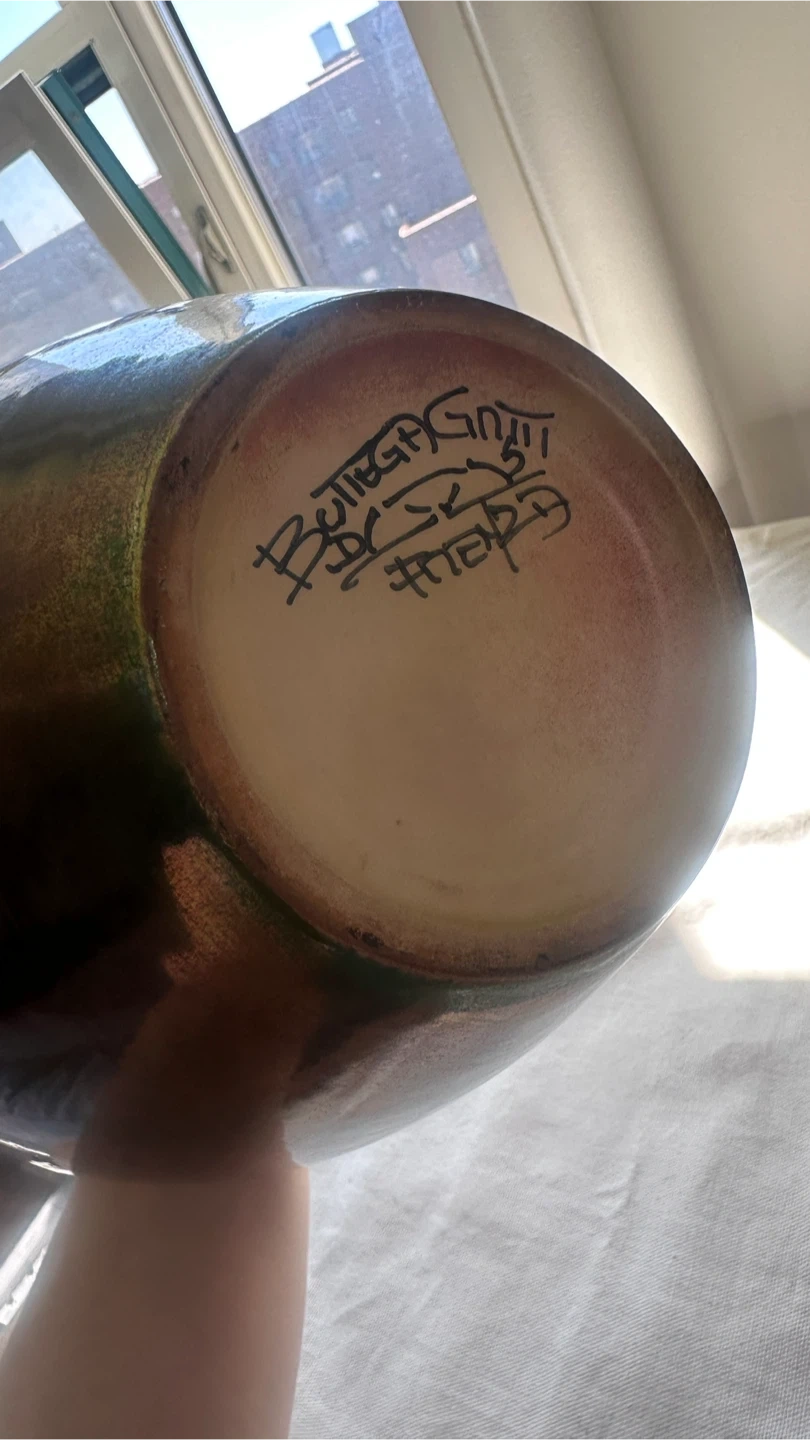 Selling a unique bottega gatti vase with a beautiful iridescent finish. There is a small crack on the rim, as pictured. It has a small fixed chip on the rim is why the price so low (usually goes by thousand)
