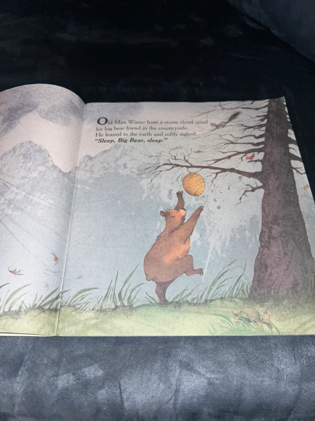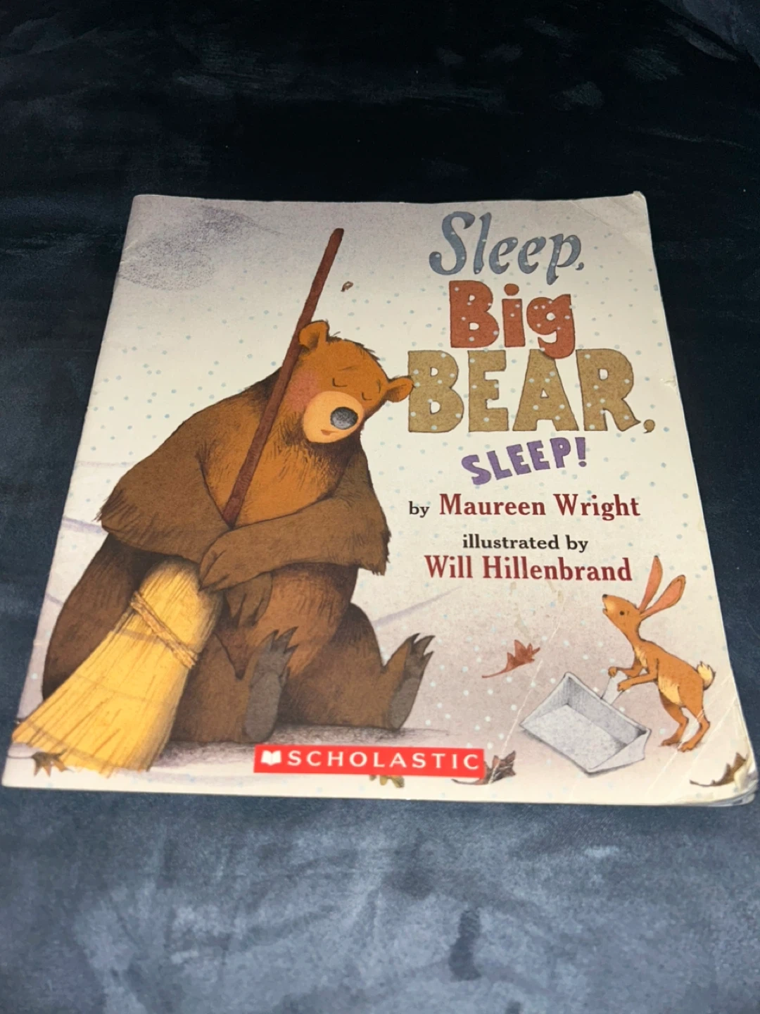 This is the "Sleep, Big Bear, Sleep!" book, written by Maureen Wright and illustrated by Will Hillenbrand. It's a children's storybook for young readers. Scholastic edition. Well loved, fun to read, and lovely detailed artwork.