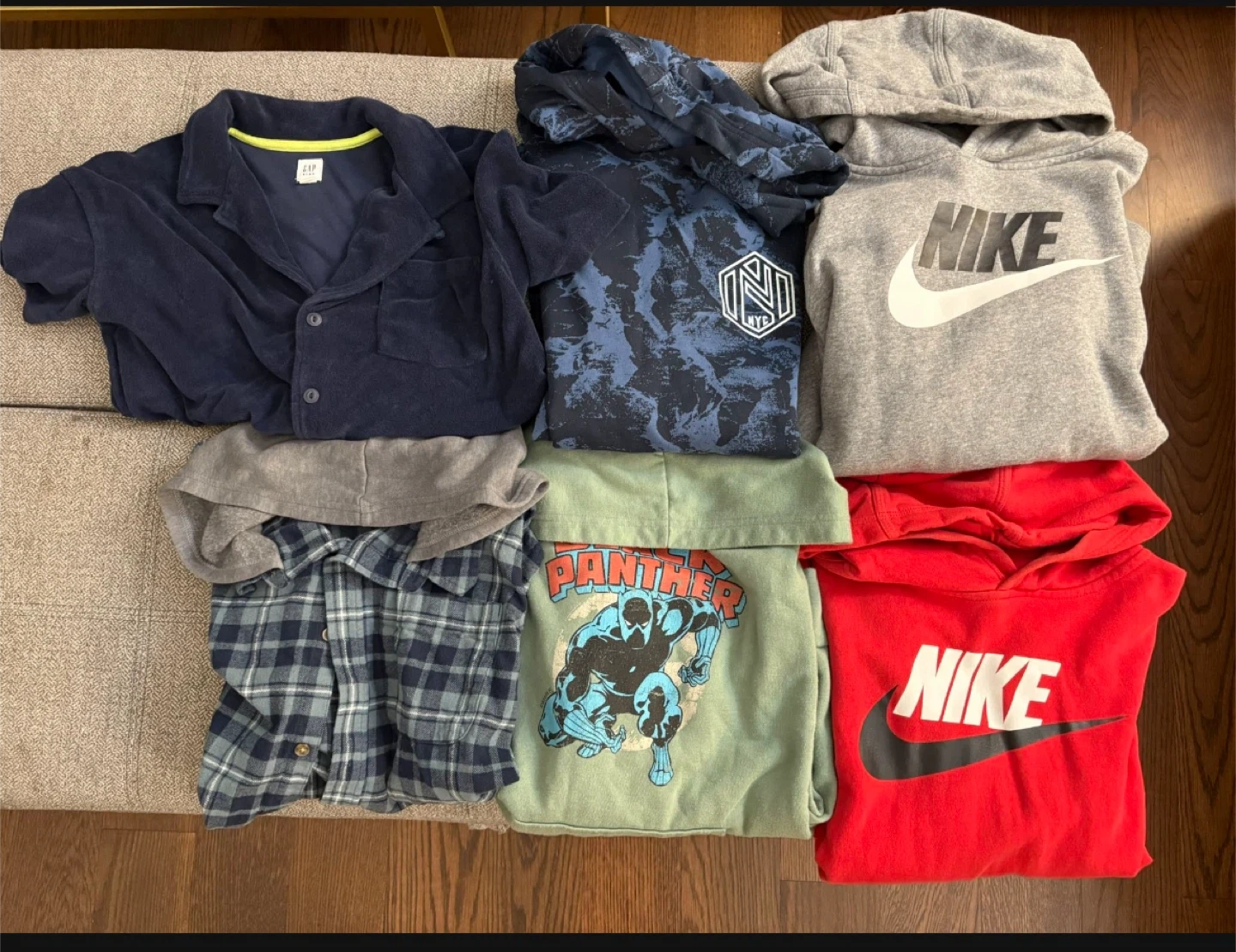 Selling a bundle of boys' clothing that includes: - A navy blue button-down shirt from Gap - A blue patterned hoodie - A gray Nike hoodie with the iconic swoosh logo - A blue and gray flannel shirt - A light green Black Panther t-shirt - A red Nike hoodie with the swoosh logo All size XL kids!