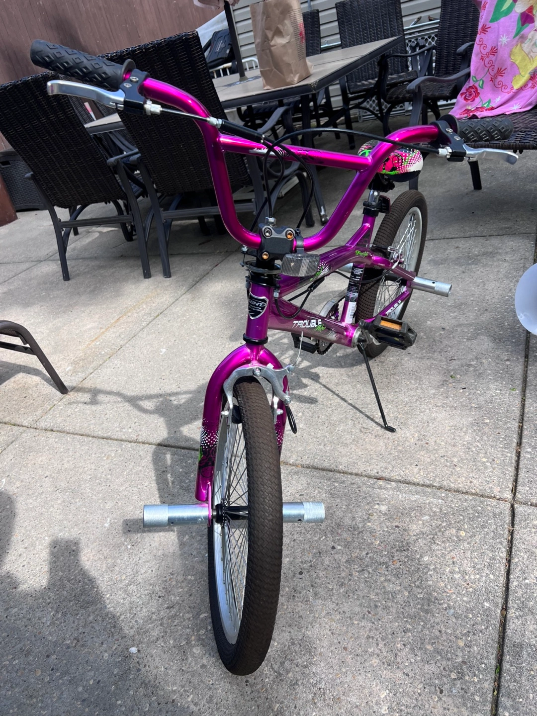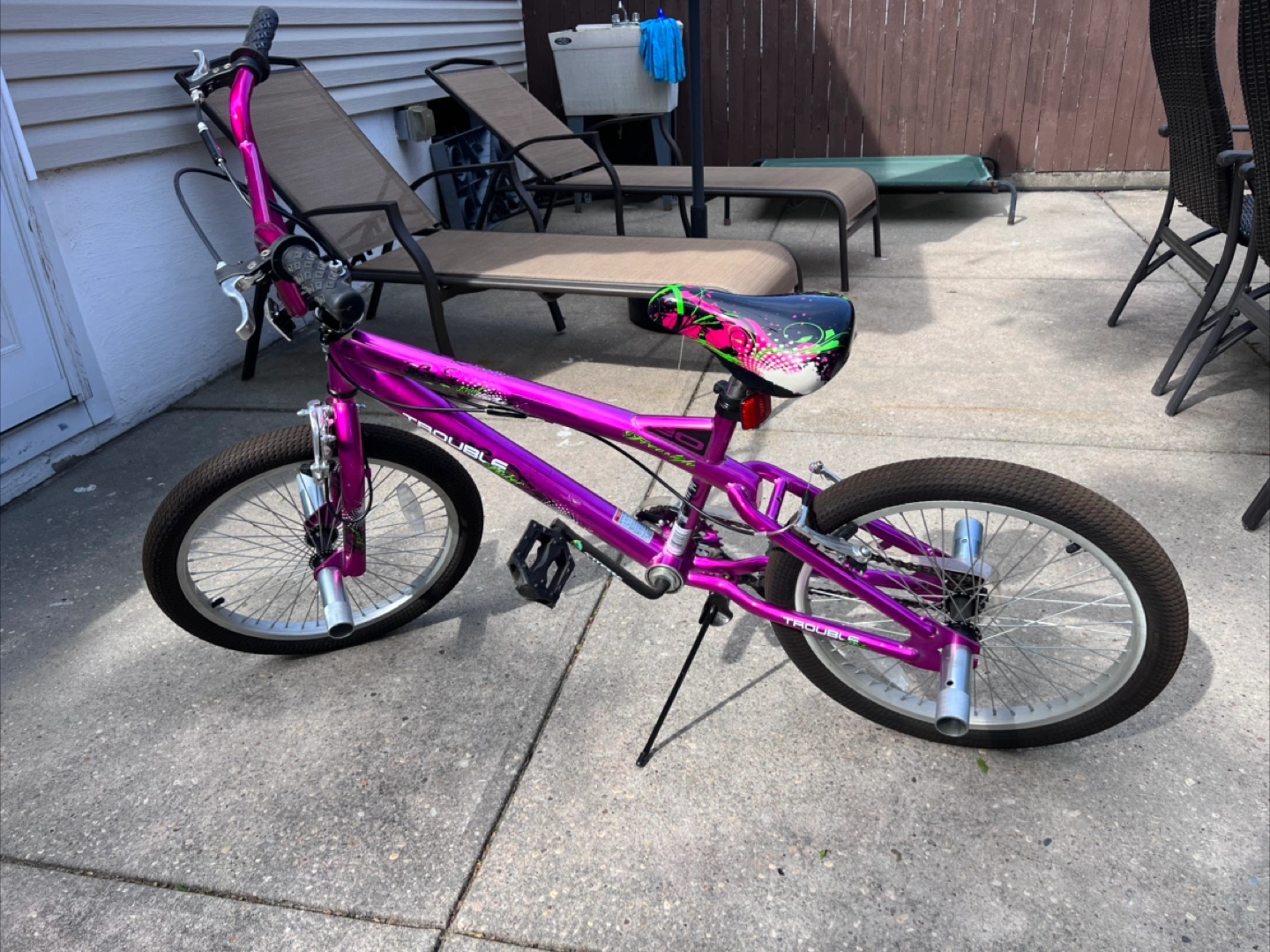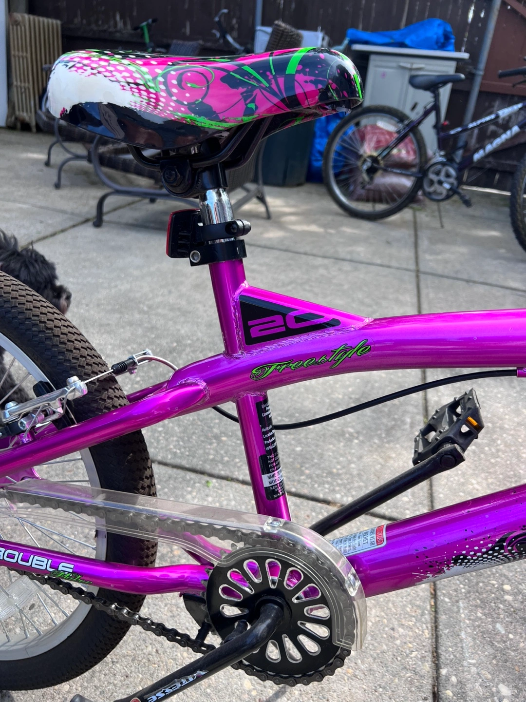Purple girls' BMX bike. 20-inch wheels. Features a freestyle design. Like new condition. Used for one summer only . No delivery/cash only . Thanks