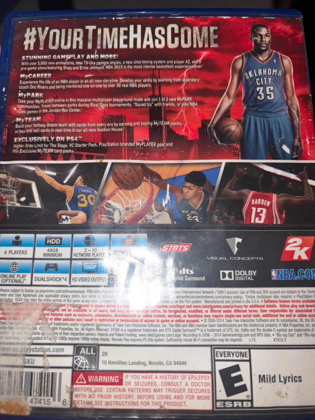 This is the NBA 2K15 video game for PlayStation 4. It features your favorite NBA players and teams. The game includes gameplay and MyPARK modes. It's rated E for Everyone.