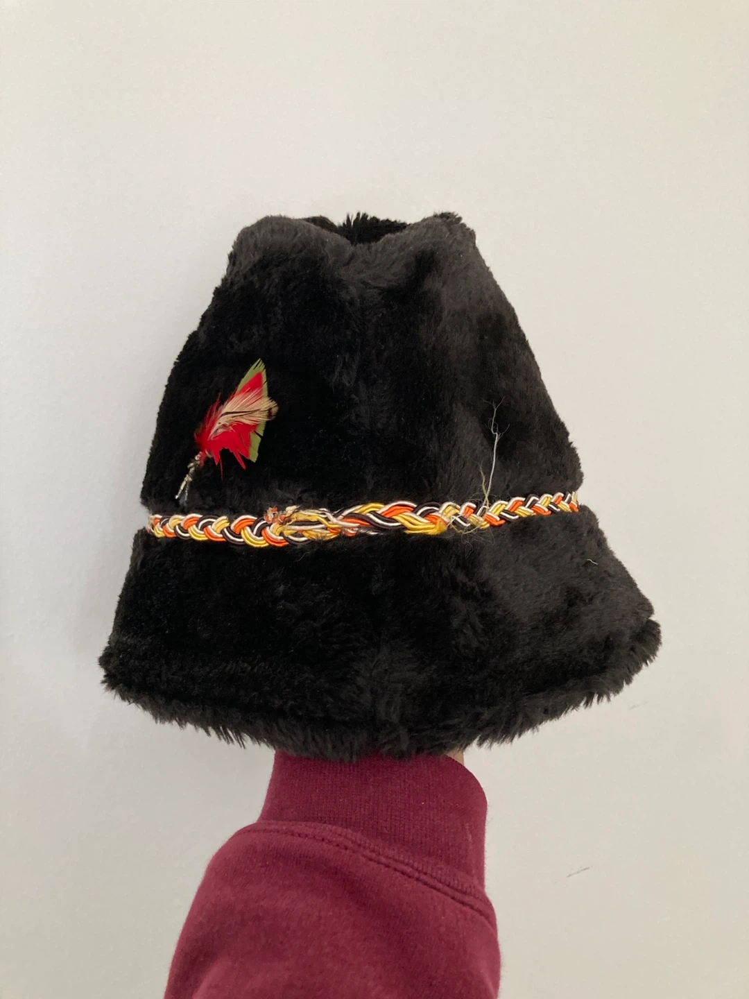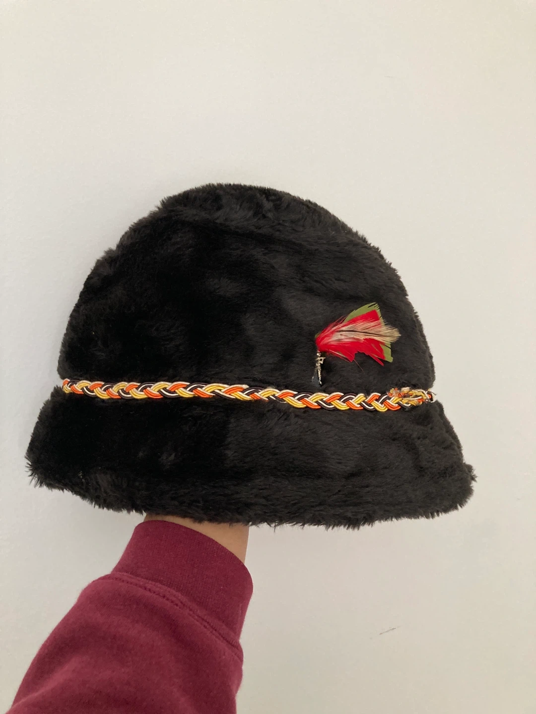 This hat is made of soft faux fur and features a colourful braided band with a red and green feather accent. It has a classic, rounded shape. It's a unique accessory to add to your collection!