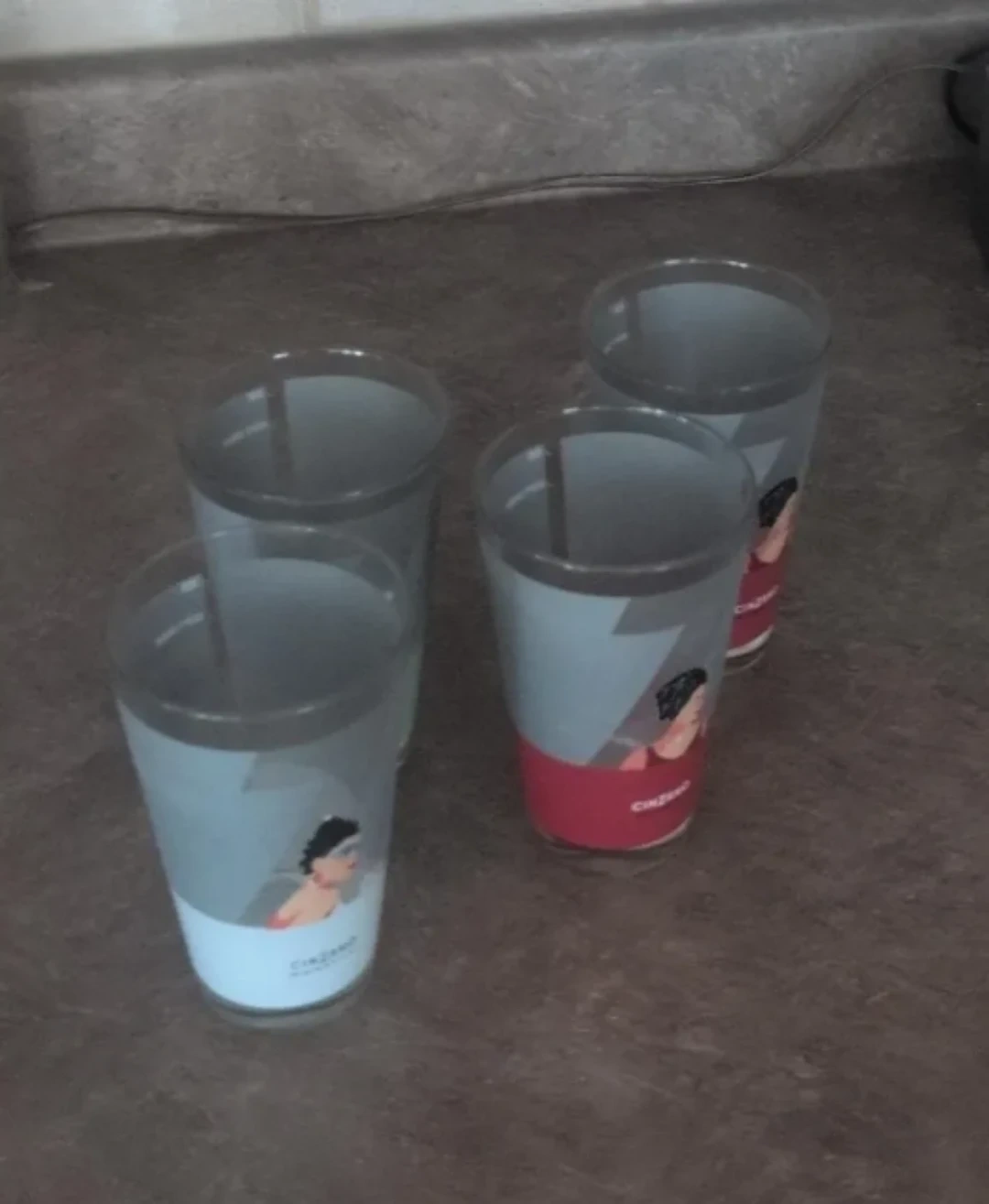Four drinking glasses with Cinzano branding. Each glass features a graphic of a person. They're great for serving beverages!