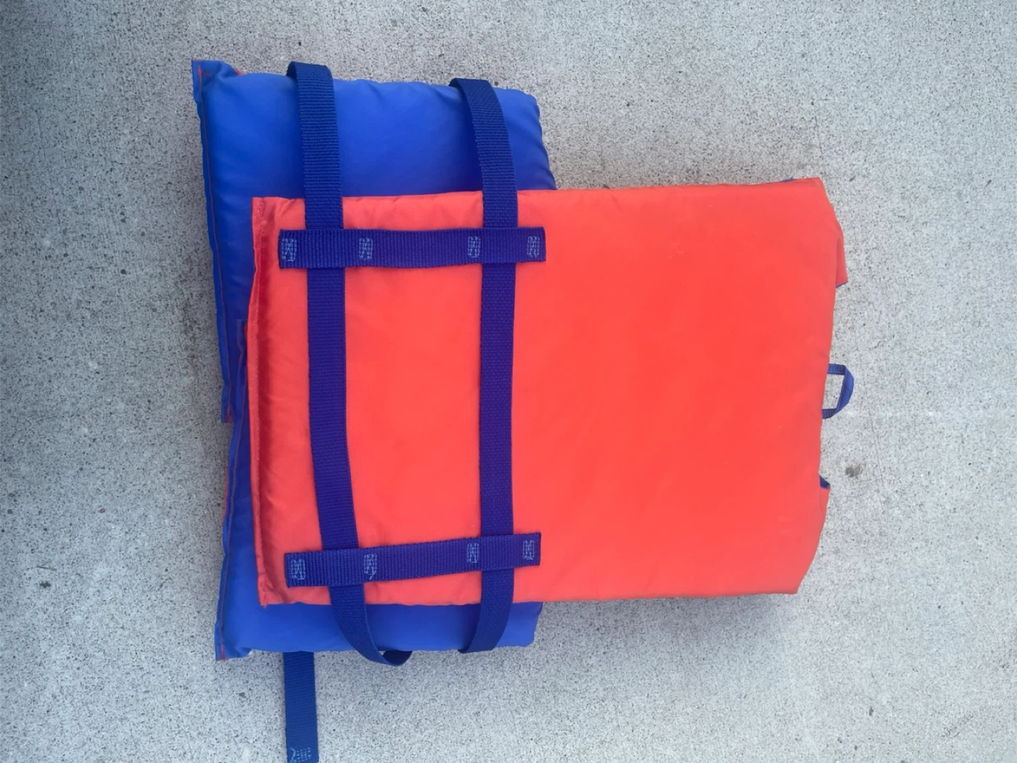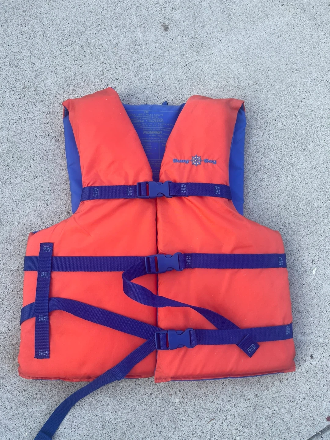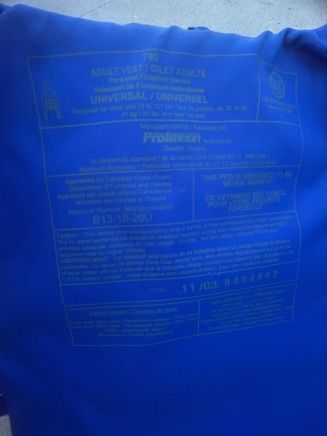 This Prolaxion life vest is designed for adults. It's a universal fit for chest sizes 79 to 127 cm and weights 81 kg/180 lbs and over. The exterior is 100% nylon, and it's filled with 100% polyethylene foam.