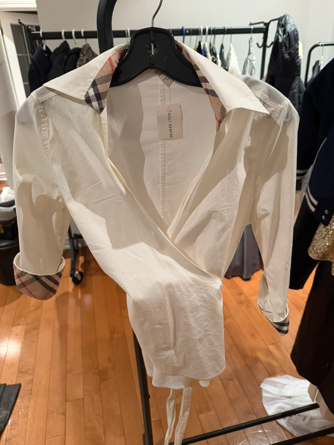 This white wrap blouse features the iconic Burberry check print on the collar and cuffs. It's a stylish addition to any wardrobe. Cotton material.