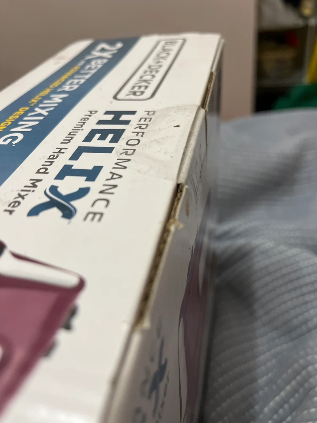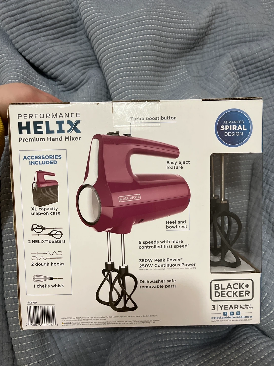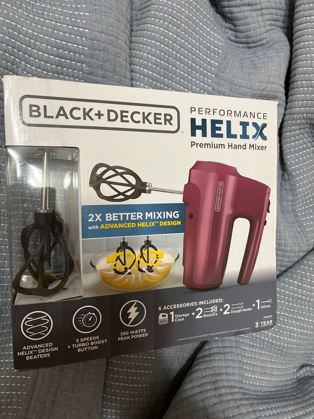 Brand new unopened Black+Decker hand mixer. It has 5 speeds with a turbo boost button. Includes XL capacity snap-on case, 2 Helix beaters, 2 dough hooks, and 1 chef's whisk. It's a 350-watt peak power appliance with dishwasher safe removable parts.