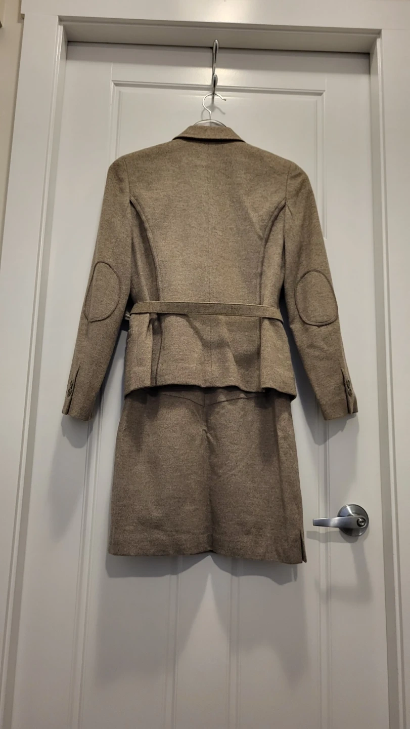 A classic two-piece women's suit set featuring a tailored blazer and a matching skirt. The blazer has elbow patches and a removable belt, while the skirt offers a timeless silhouette. This set is made from a durable, textured fabric perfect for professional settings. Great for work or special occasions.