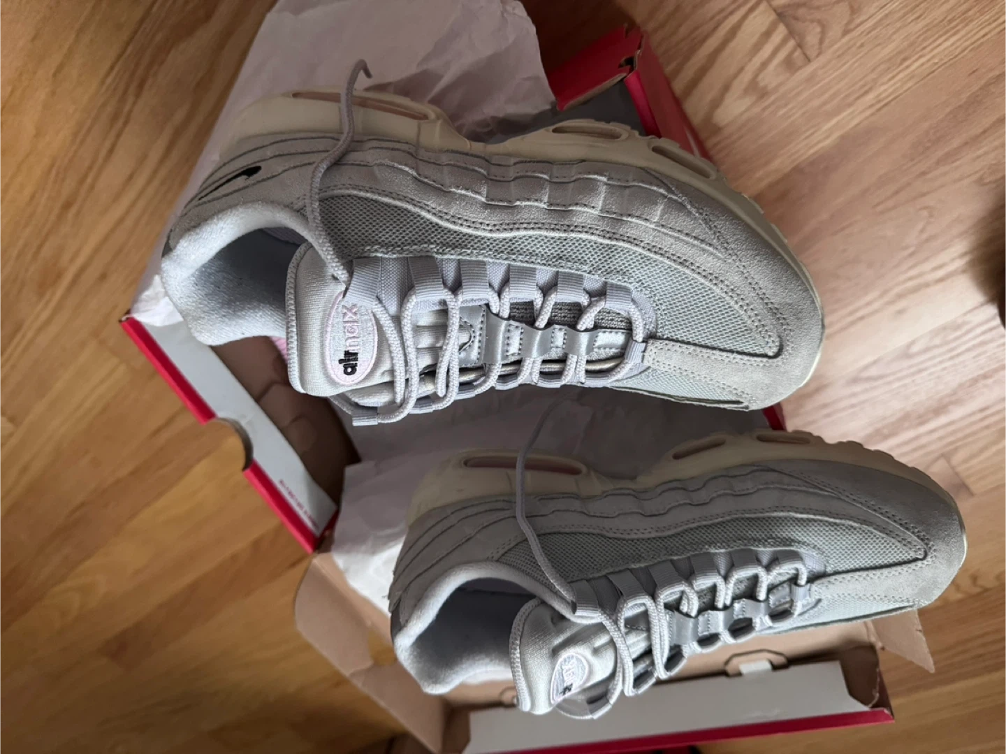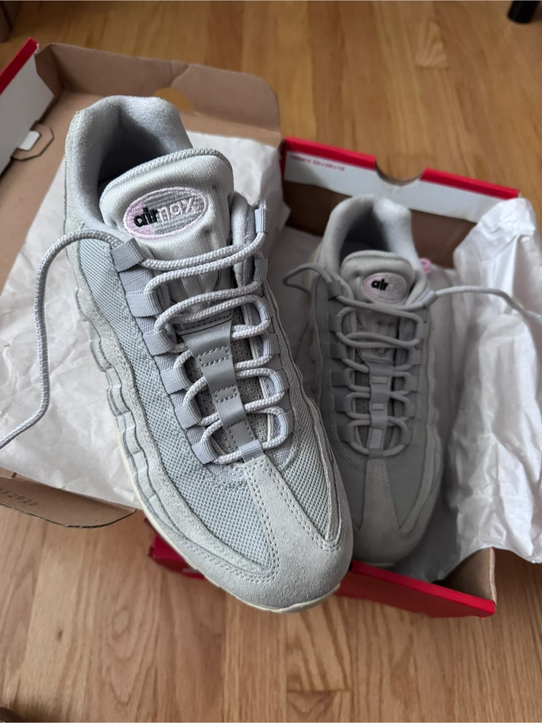 Selling a pair of Nike Air Max 95 in Grey Fog/ Pink Foam. They are size 8.5 and come with the original box. These shoes are in new condition and have an extra pair of pink laces.