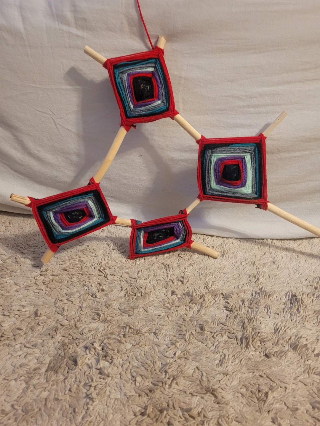 This is a handmade woven wall hanging featuring colourful yarn wrapped around wooden sticks. It's a unique piece for home decor. It has multiple woven squares connected to create a symmetrical design. It's suitable for adding a bohemian touch to any room.