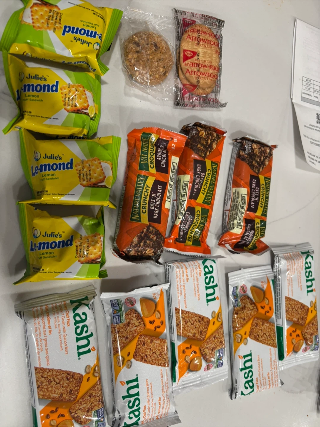 Includes Julie's Le-mond puff sandwiches, Nature Valley crunchy oat bars, and Kashi oat flax bars. Also contains Arrowroot biscuits and a single chocolate chip cookie. Variety pack for different snack cravings!