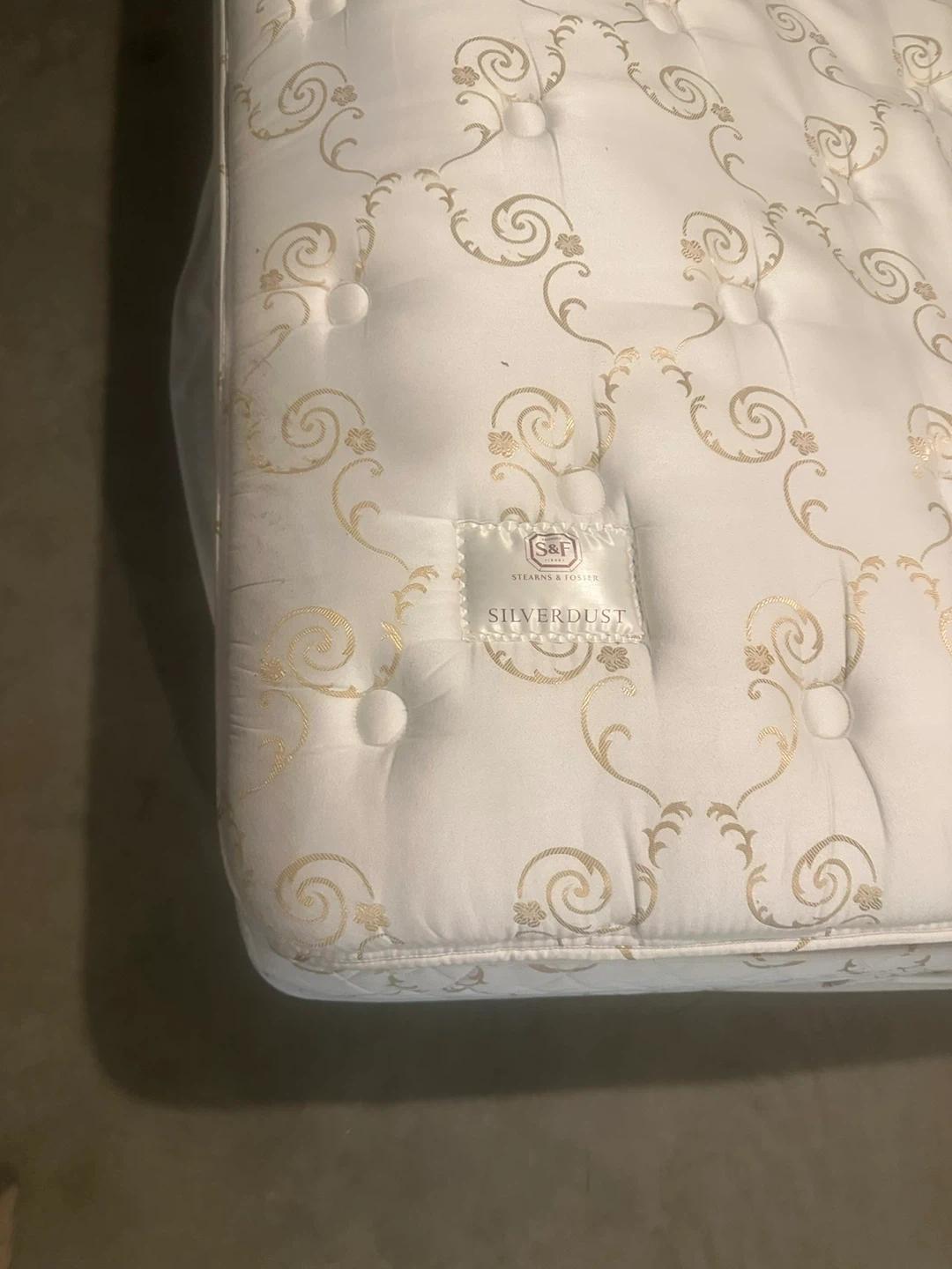 This Sealy Silverdust mattress offers a comfortable sleeping surface. It's a queen-sized mattress with a white and gold damask pattern. The mattress is tufted for a plush feel.