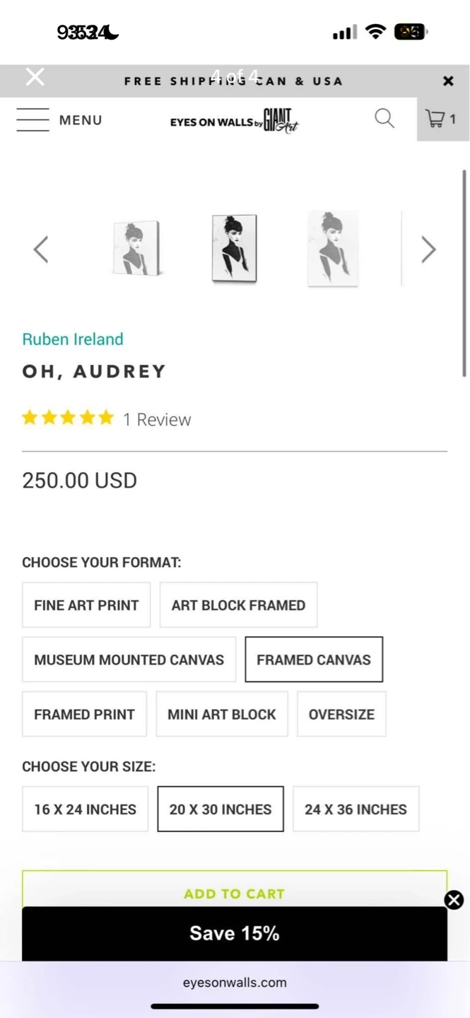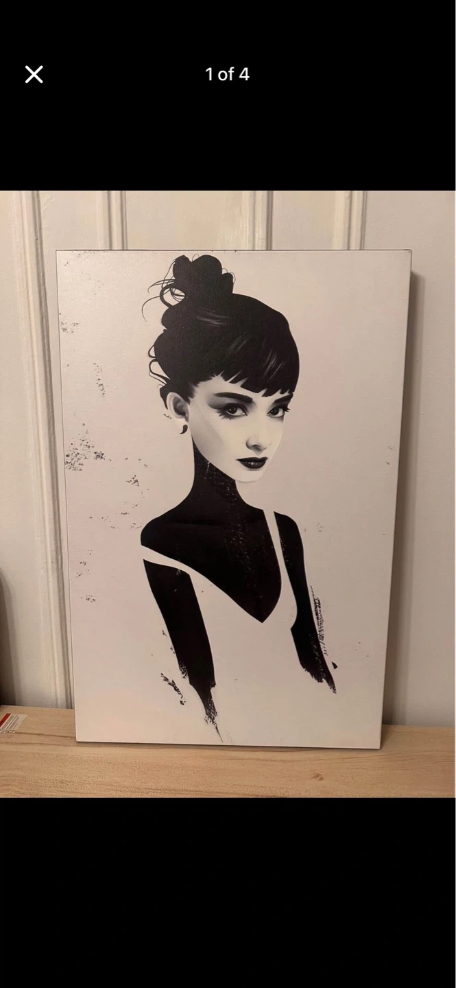 This Ruben Ireland "OH, AUDREY" art print is a framed canvas. The print is black and white and features a portrait of a woman. It's 20 x 30 inches. This piece is ready to hang on your wall!