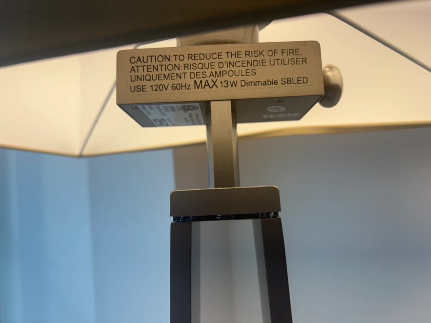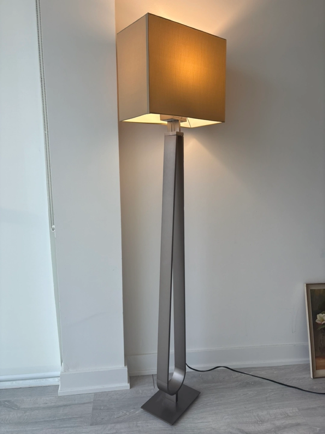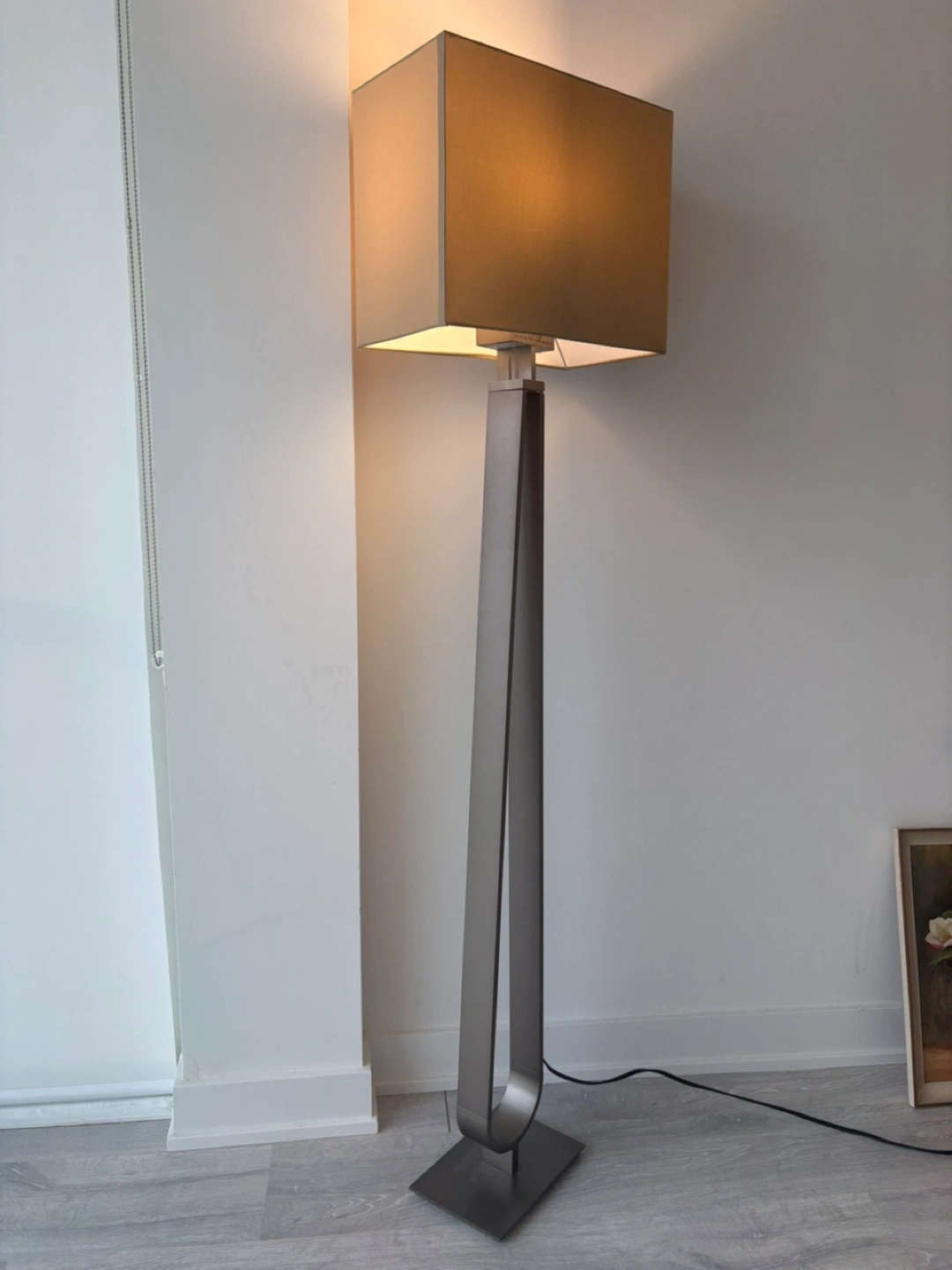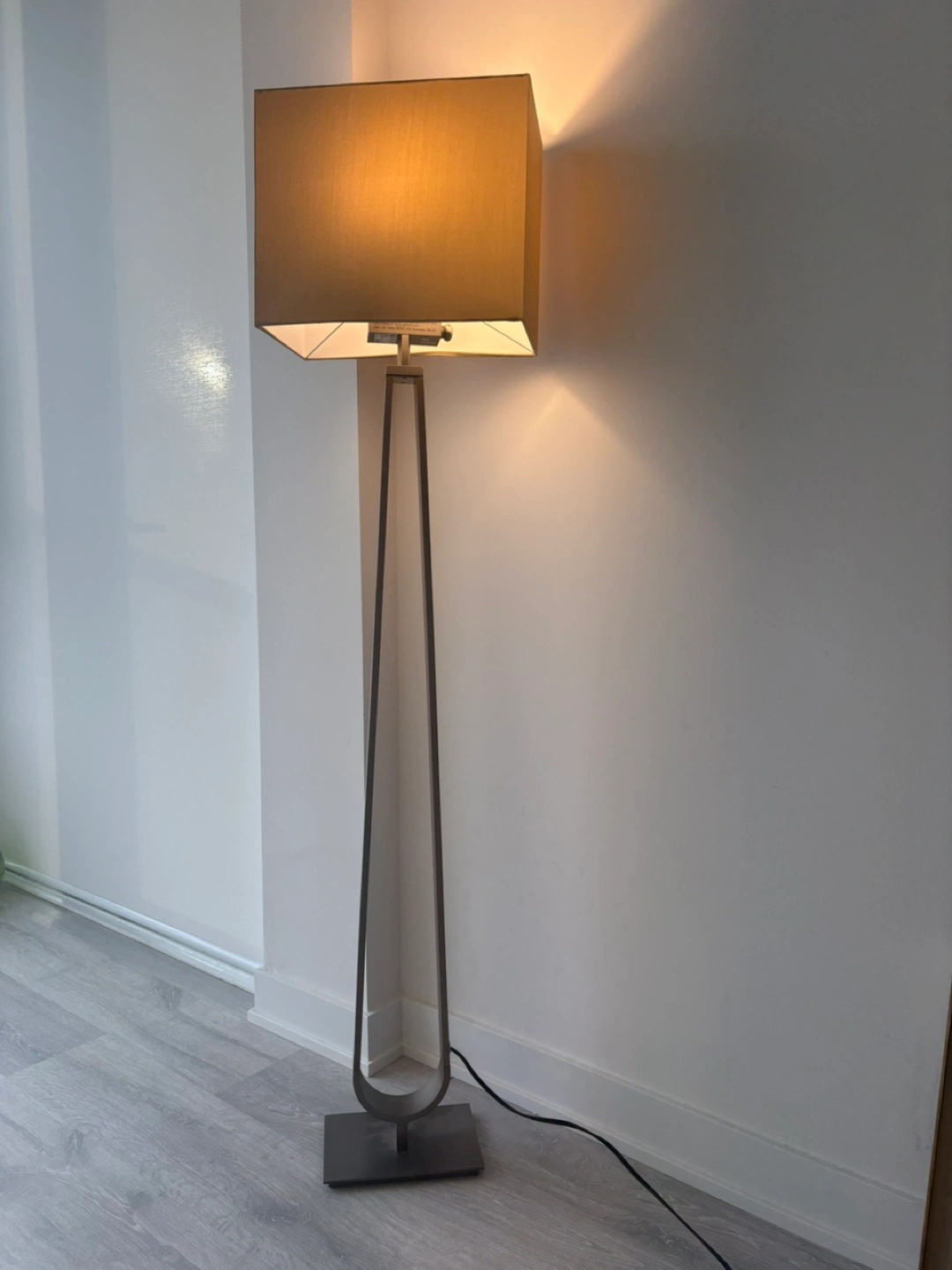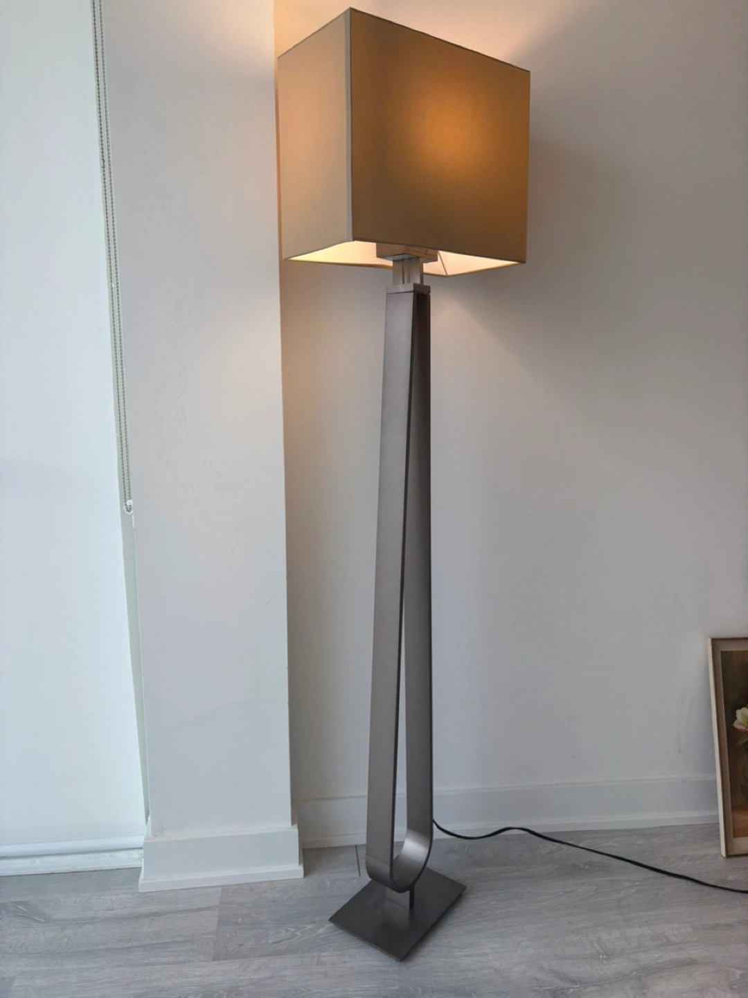 Tall, sleek floor lamp. Grey metal frame. Beige fabric shade. Dimmable LED bulb. Excellent condition.
