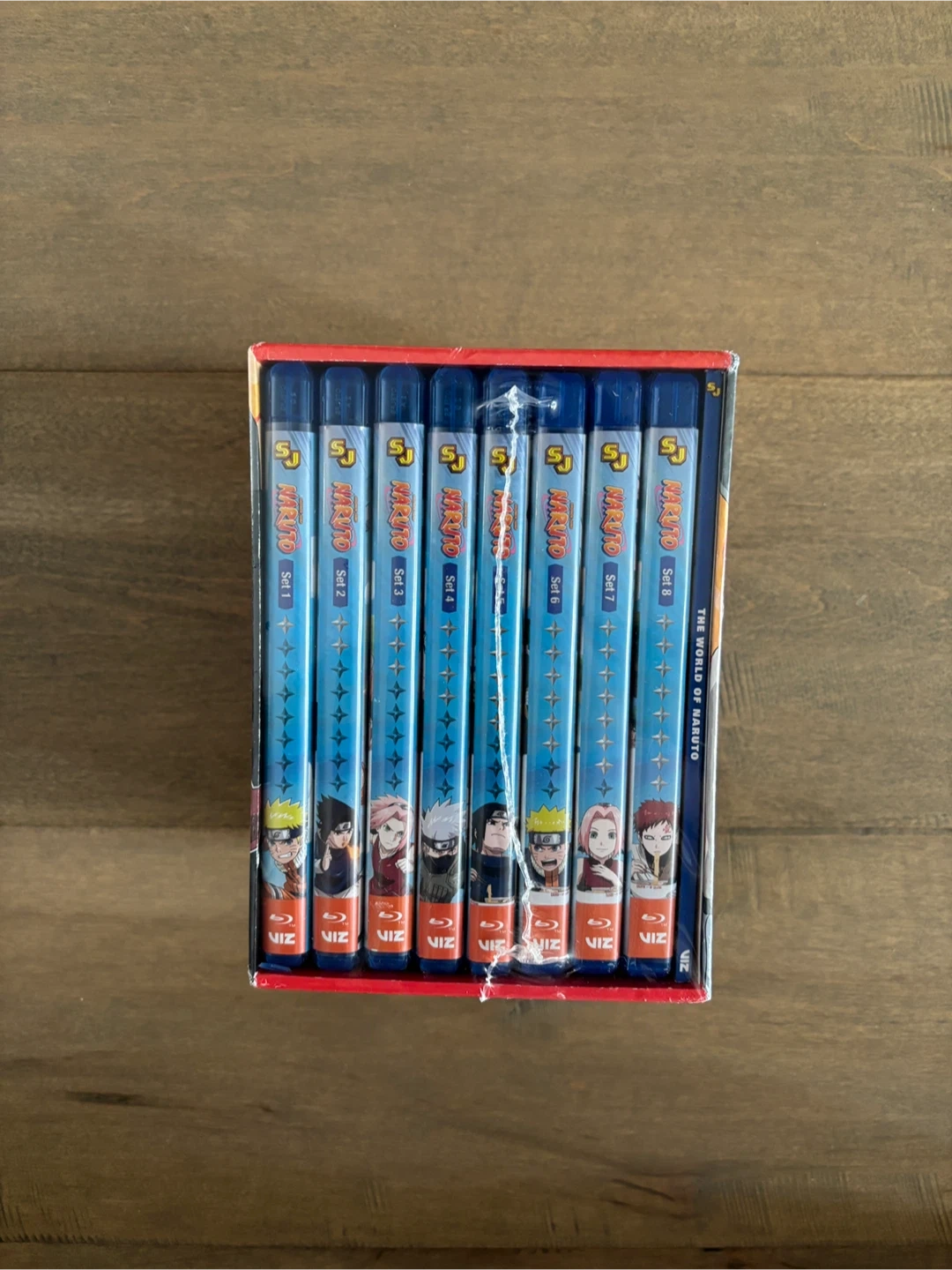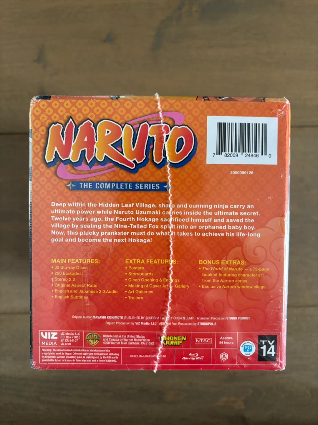 Naruto The Complete Series Blu-ray box set. Includes 32 Blu-ray discs. Features English and Japanese audio with English subtitles. Bonus extras include a 72-page booklet and making-of art gallery.