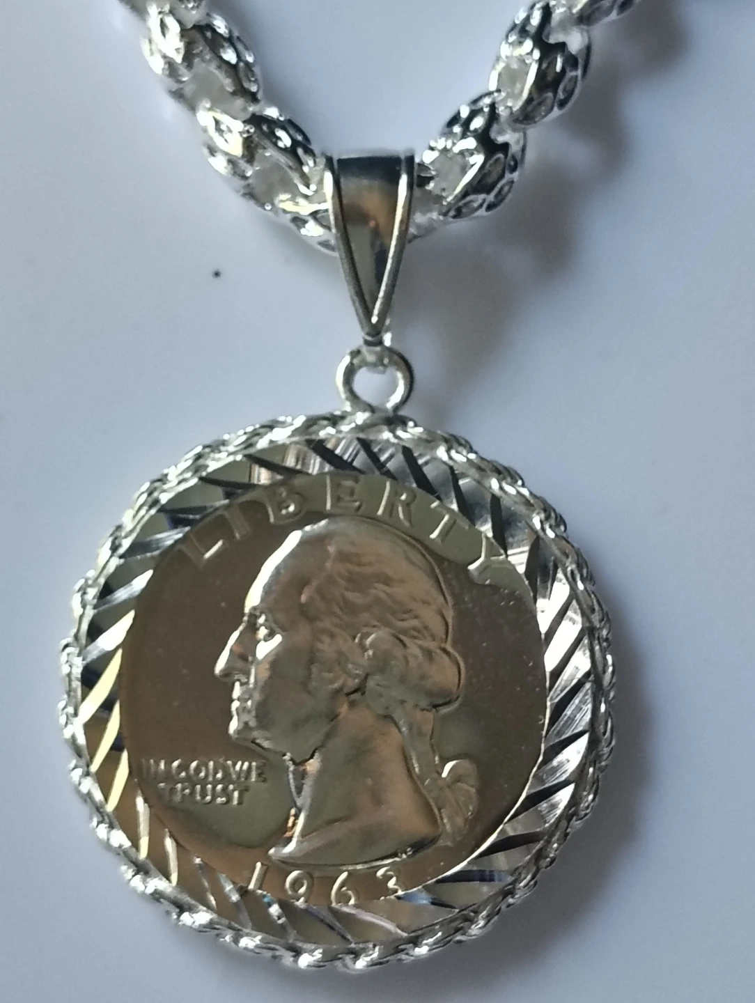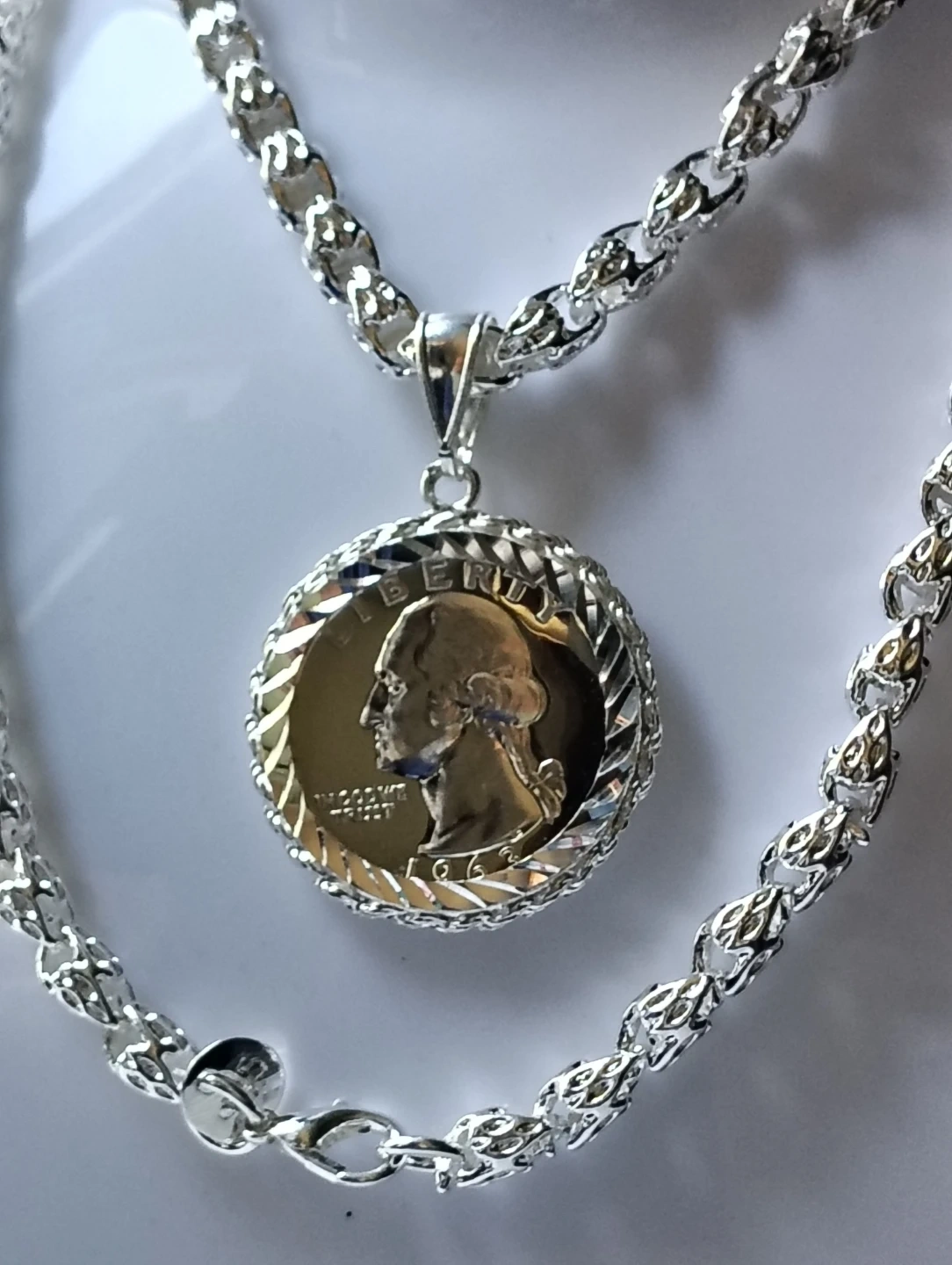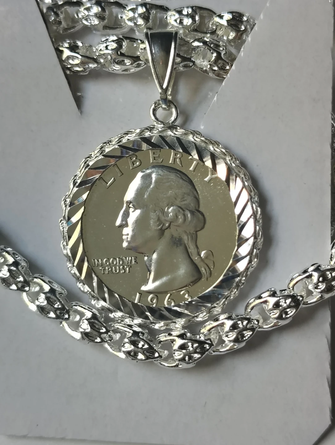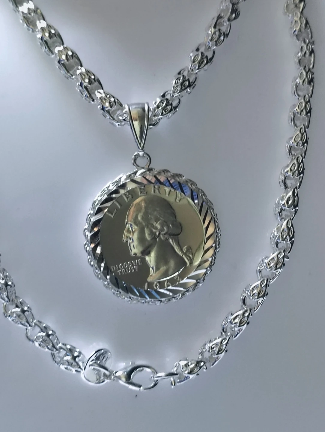 This pendant features a 1963 Washington quarter, set in a silver-tone metal bezel. The chain is silver-tone and includes a lobster clasp. A classic piece for coin collectors and jewelry enthusiasts!