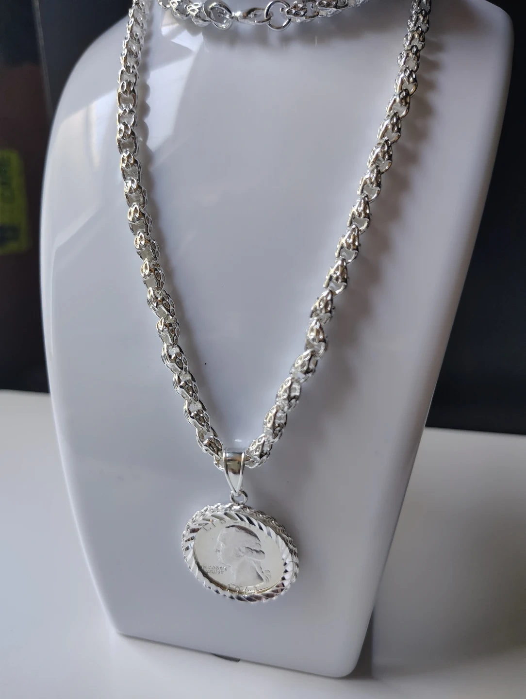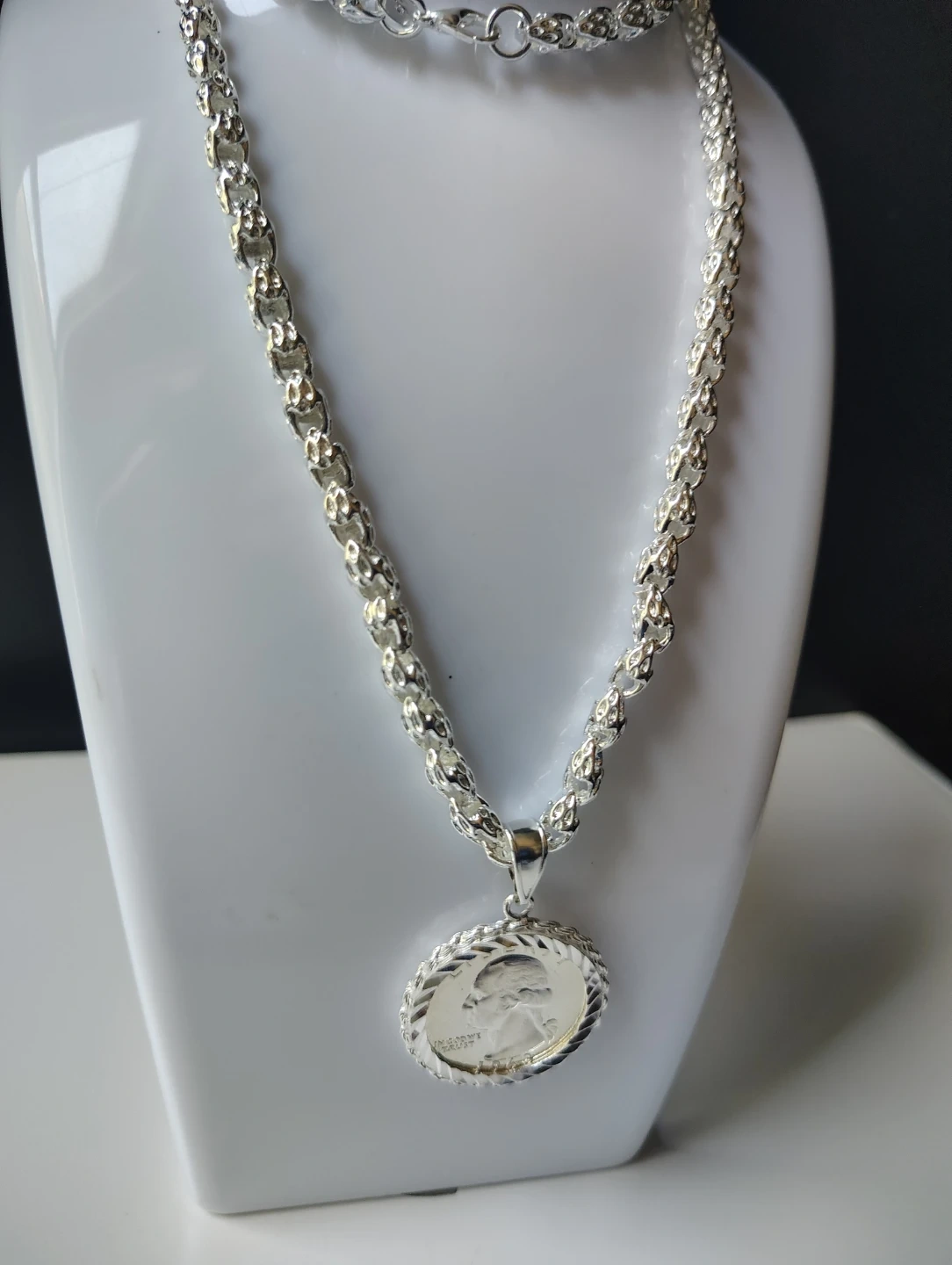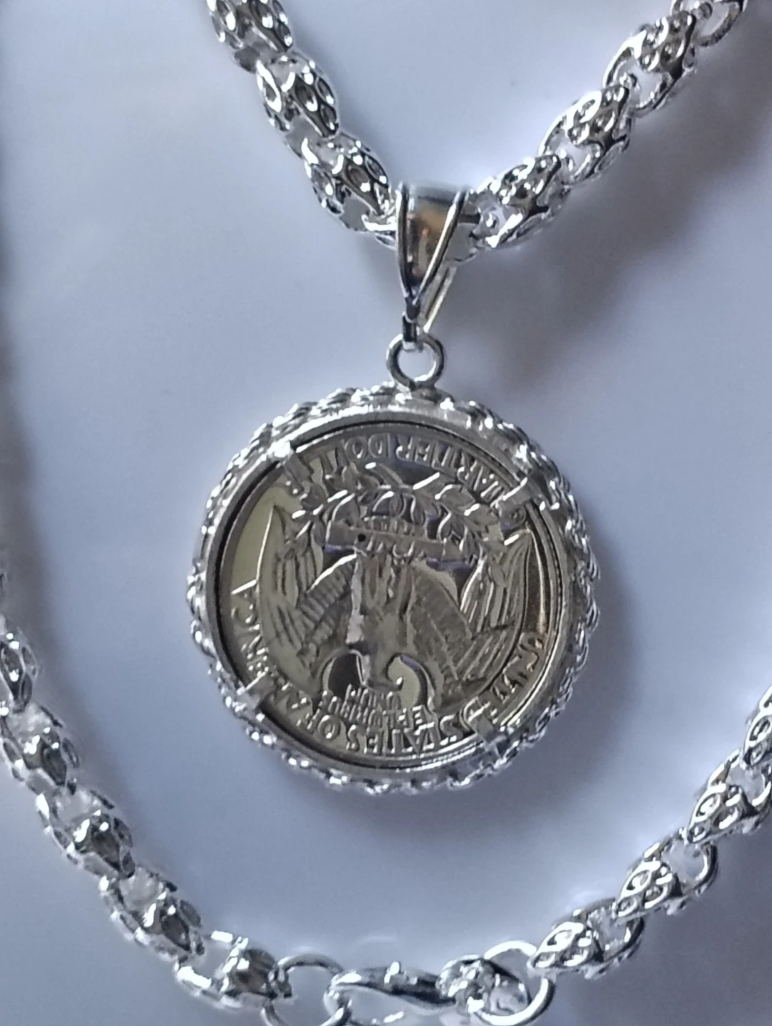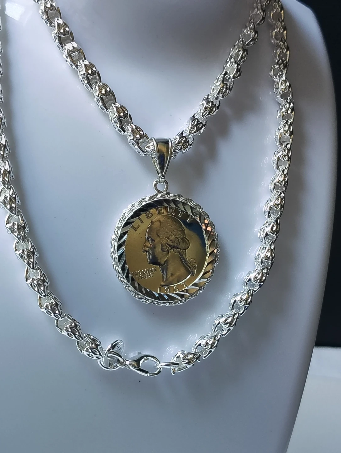 This pendant features a 1963 Washington quarter, set in a silver-tone metal bezel. The chain is silver-tone and includes a lobster clasp. A classic piece for coin collectors and jewelry enthusiasts!