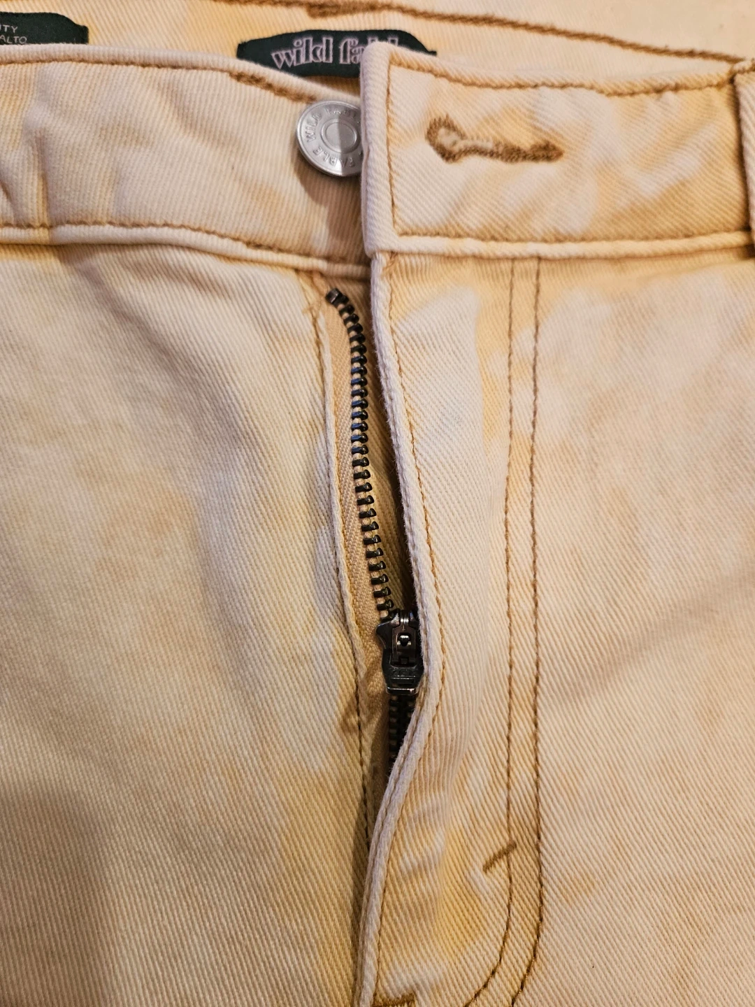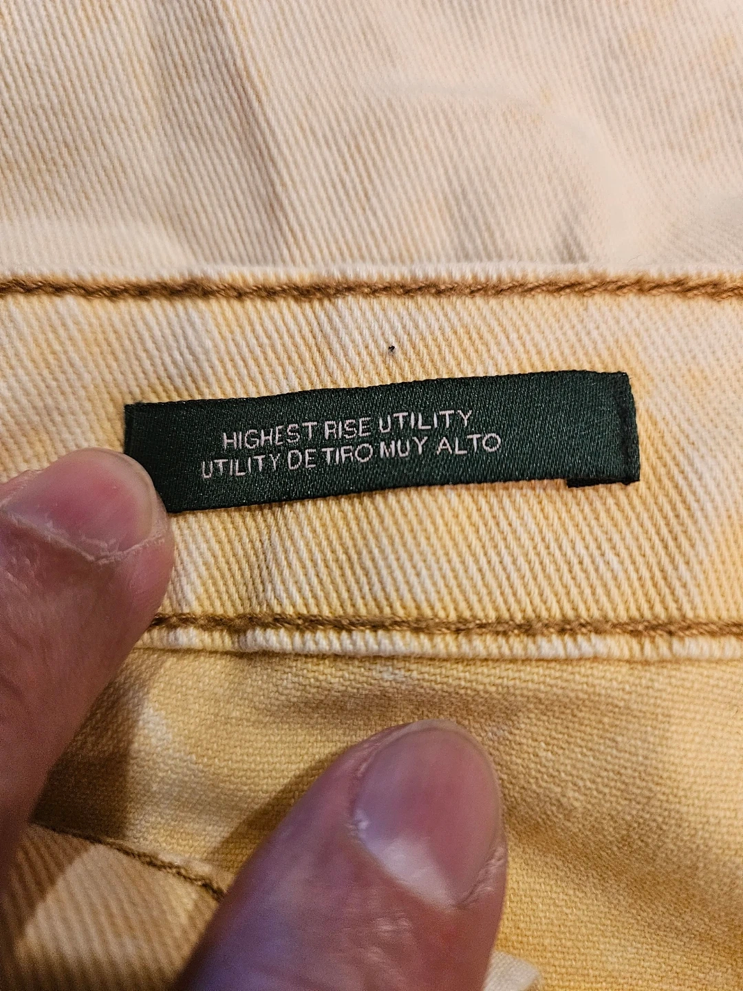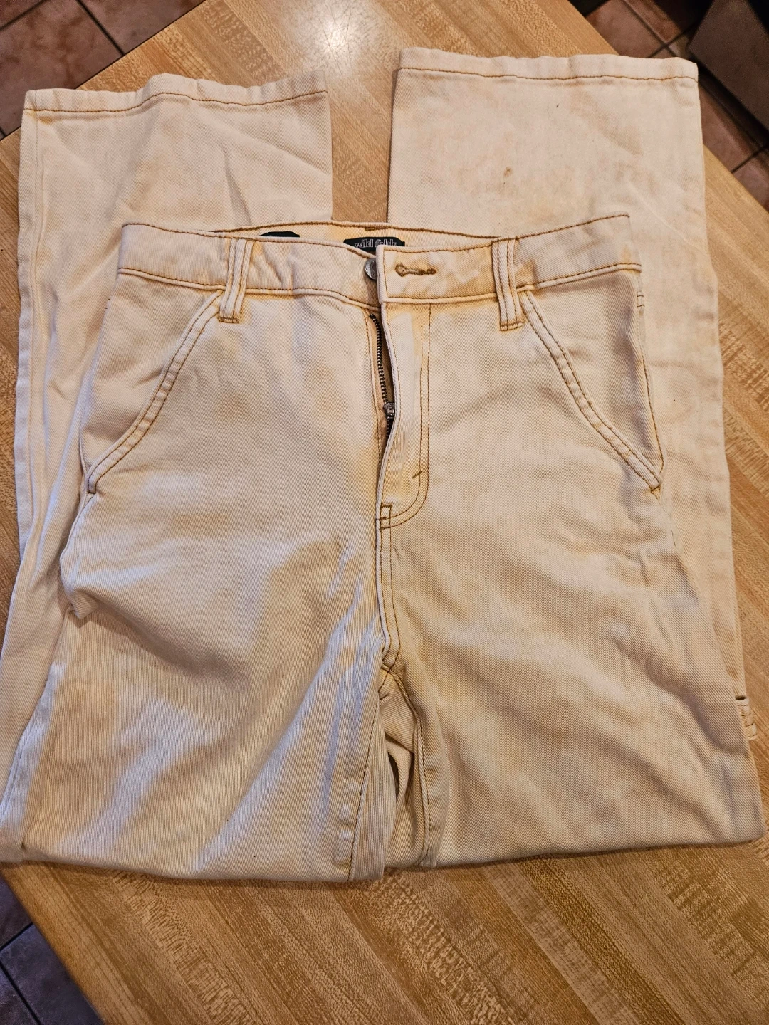 Selling a pair of Wild Fable utility pants in a size 0. They have a high rise and are a beige color. These pants are perfect for a casual and stylish look! Pants are 36 inches long. They do have some spots at bottom of right leg. Picture attach spots. You can barely see them.