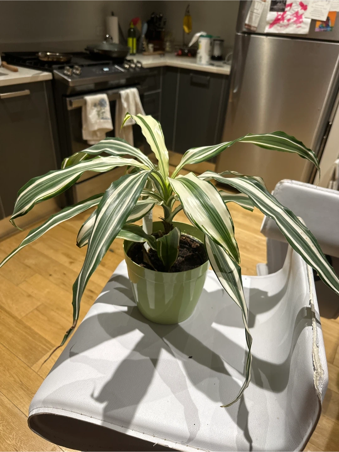 A variegated Corn Plant in a light green pot. This plant features long, arching leaves with green edges and creamy white or yellow stripes. It's a popular houseplant known for its attractive foliage. Great for adding a touch of green to your living space!