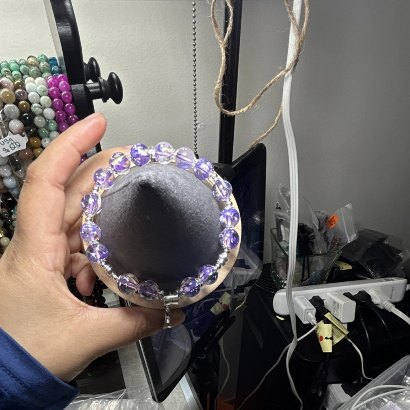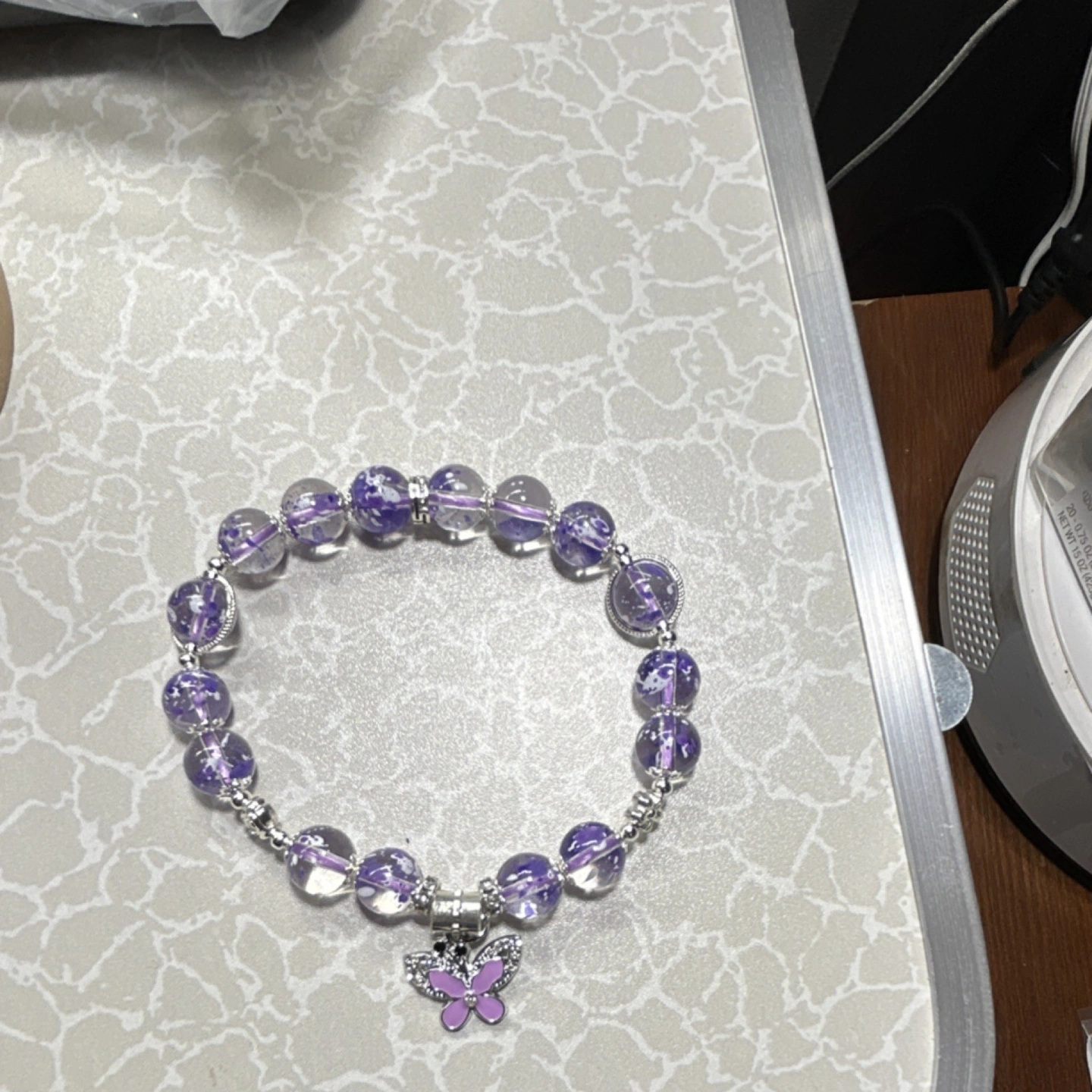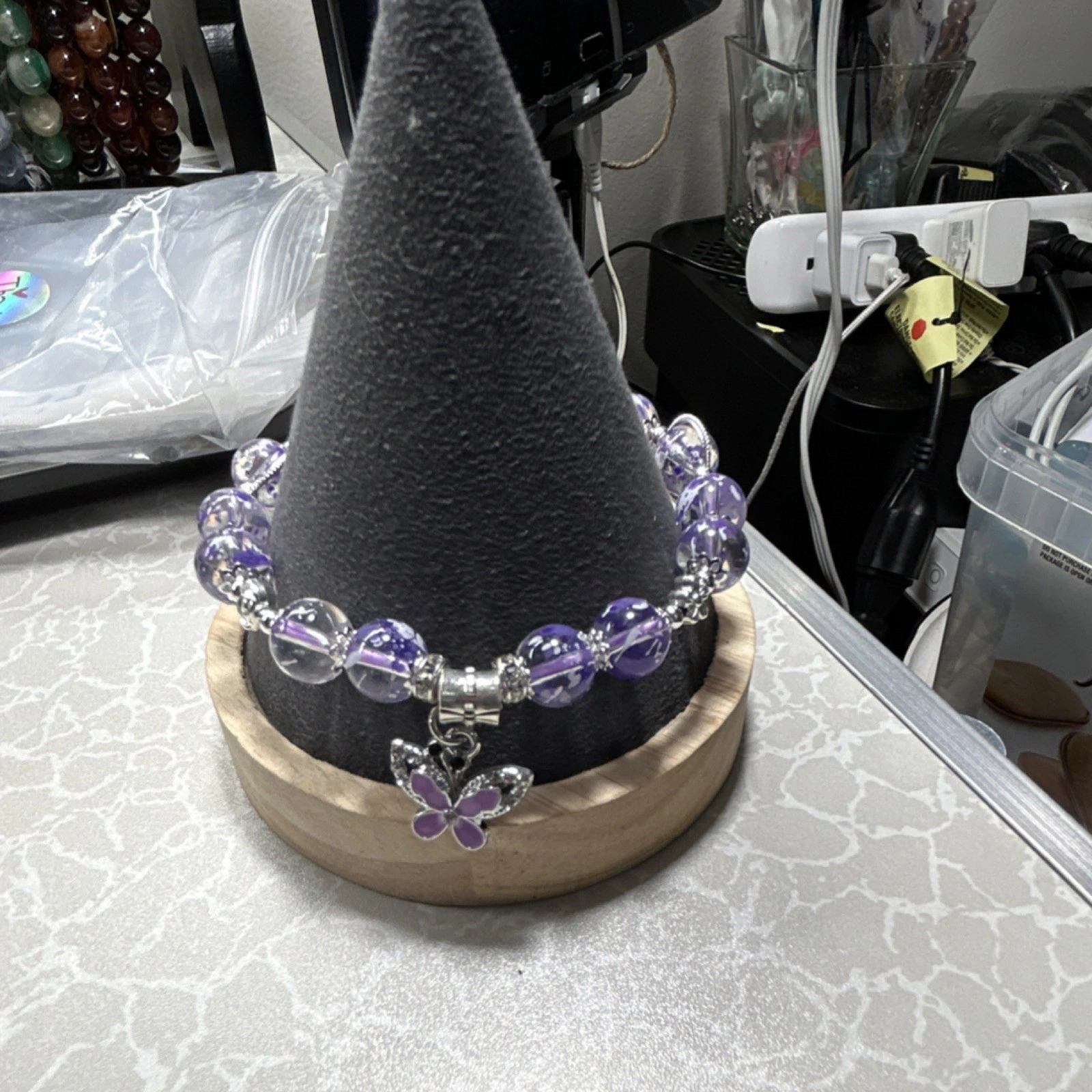 New with tags. Features purple glass beads with a silver-tone butterfly charm. This is a stretch bracelet, designed for women. Theme is fashion and costumes, with a butterfly style. It's a beaded charm bracelet.