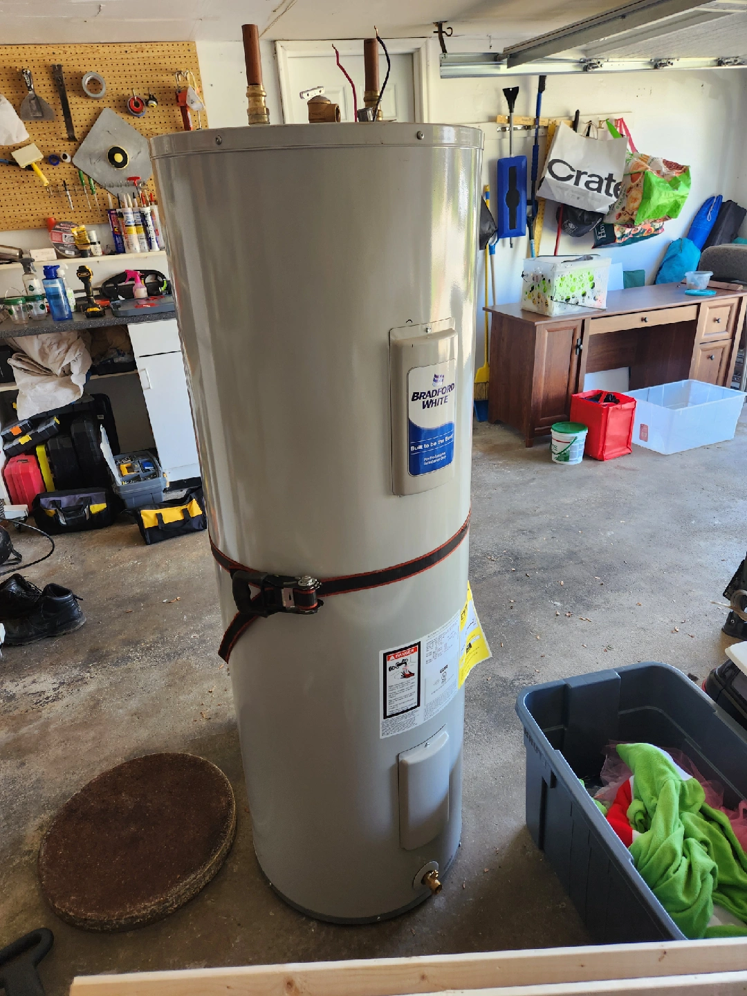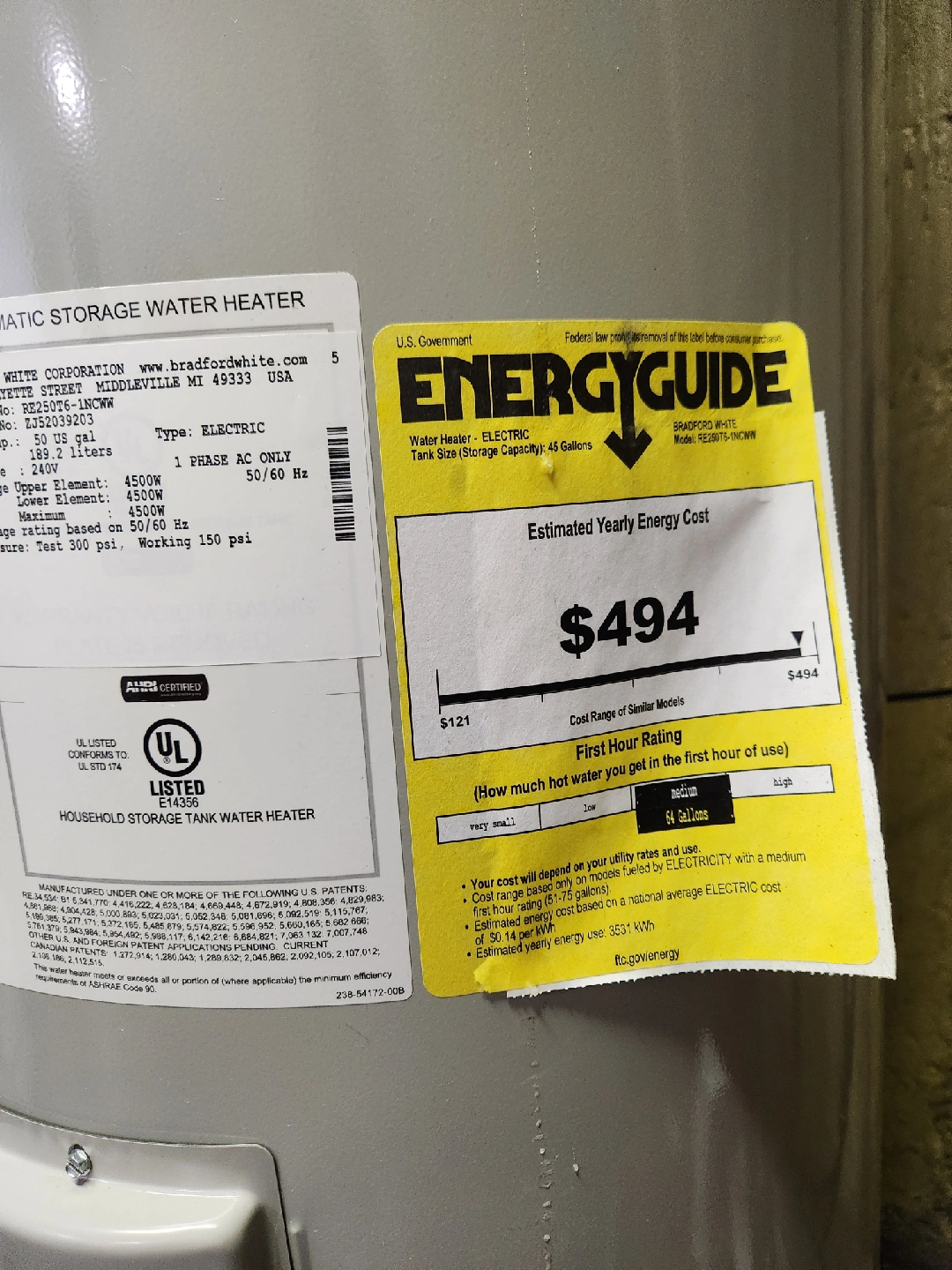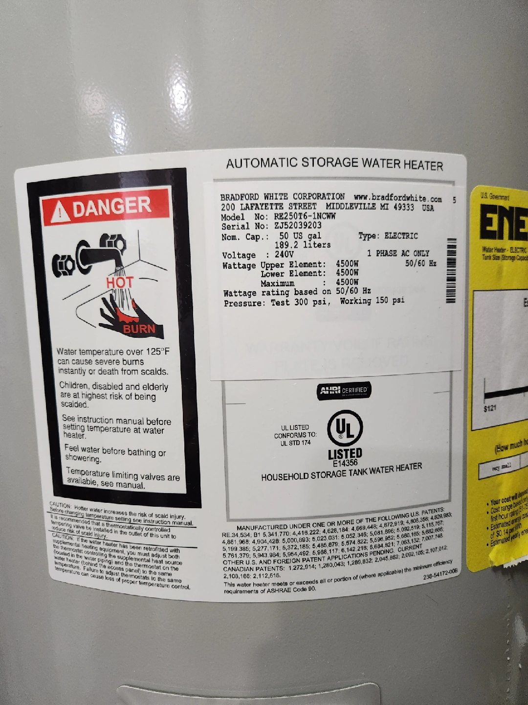 Selling a Bradford White water heater. It's an electric type with a 50 US gallon capacity. It operates at 240V and has a wattage upper element of 4500W and a lower element of 4500W. The wattage is calculated based on 50/60 Hz, working at 150 psi Temporarily used for 1 year. Works great with no issues, we wanted a bigger tank.