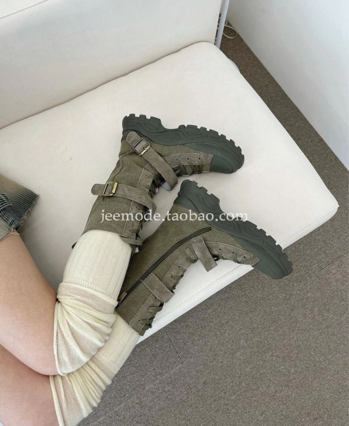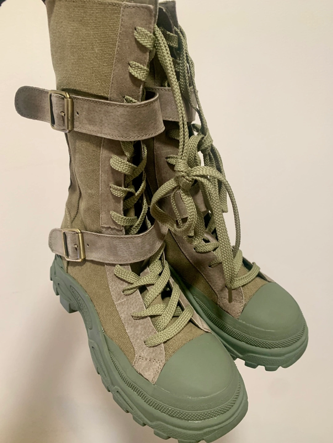 82Green canvas boots with thick soles, buckles, and laces. Brand New.