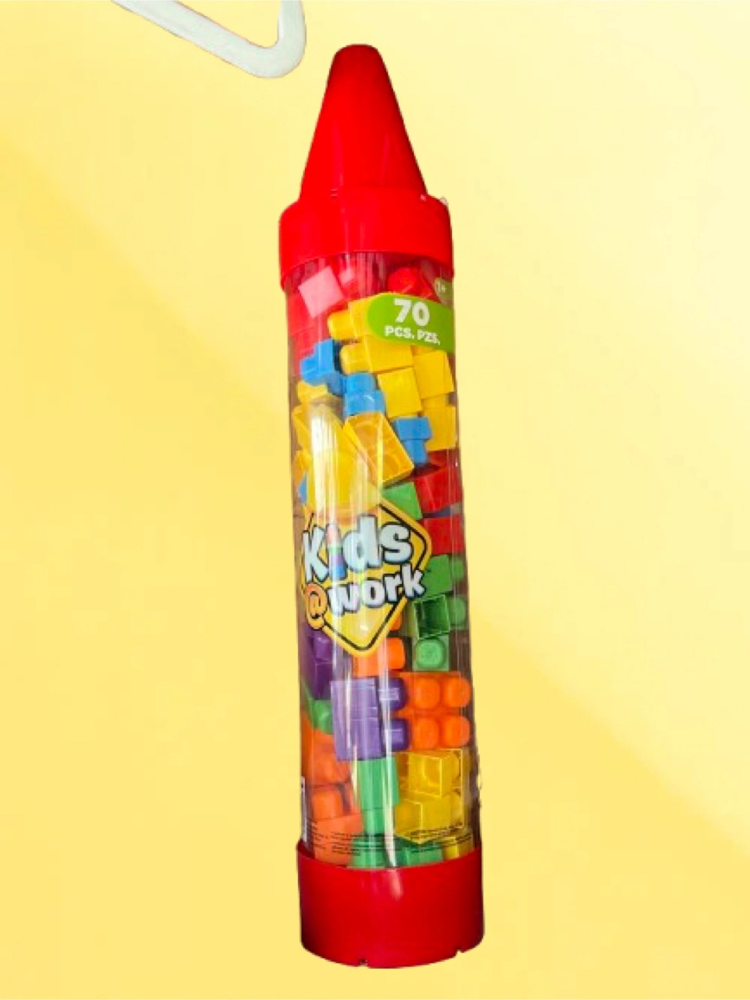 10I'm selling a set of Kids @work building blocks. This set includes 70 colorful pieces perfect for creative play. The blocks come in a unique crayon-shaped container, making it a fun and organized way to store them. Great for kids who love to build and explore!