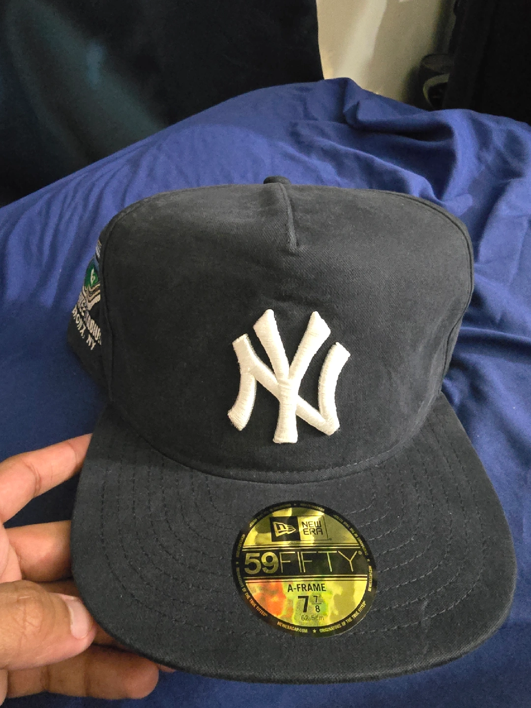 65Selling a New Era NY Yankees 59FIFTY A-Frame cap in size 7 7/8. It features the classic Yankees logo on the front and a Yankee Stadium patch on the side. The hat is brand new